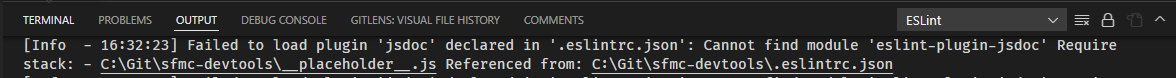 [Info - 16:32:27] Failed to load plugin 'jsdoc' declared in '.eslintrc.json': Cannot find module 'eslint-plugin-jsdoc' Require stack: - C:\Git\sfmc-devtools_placeholder_.js Referenced from: C:\Git\sfmc-devtools.eslintrc.json