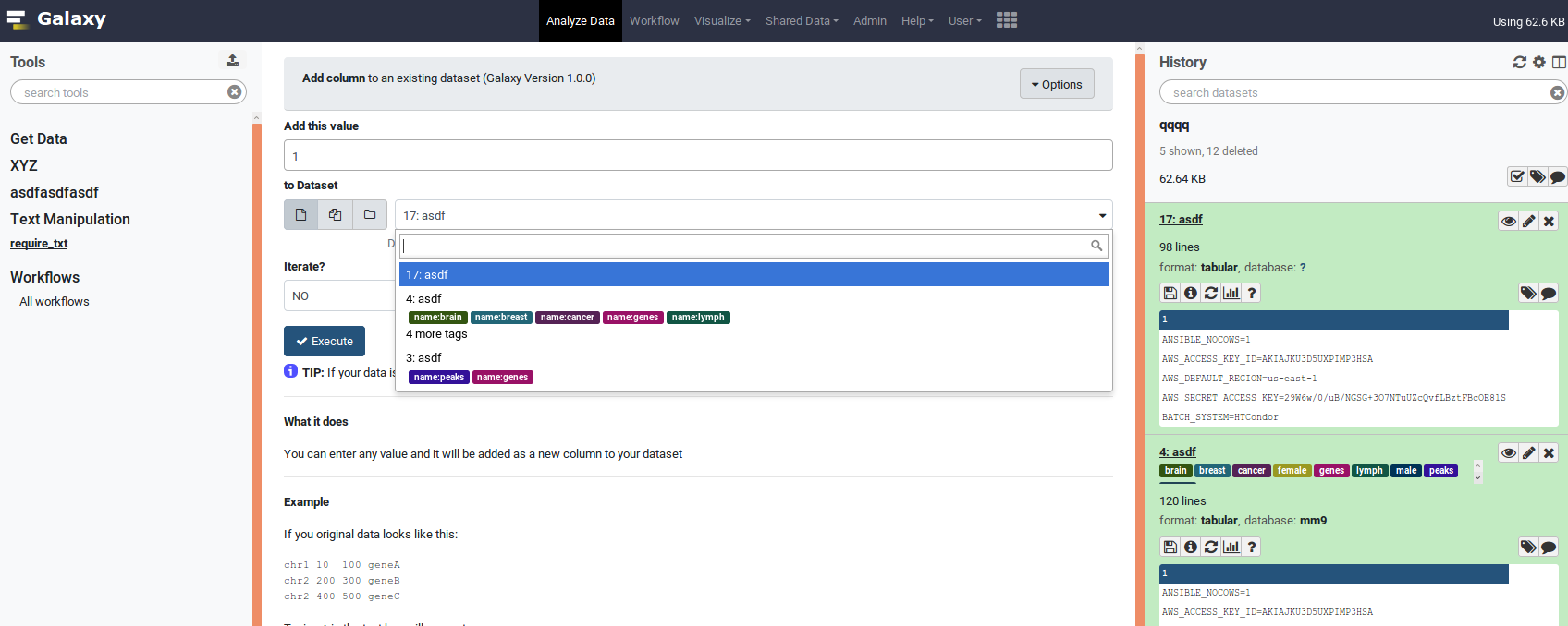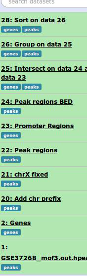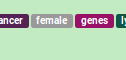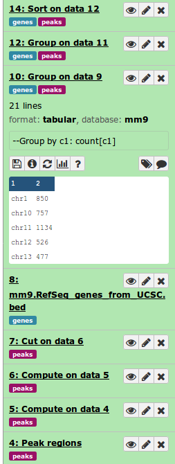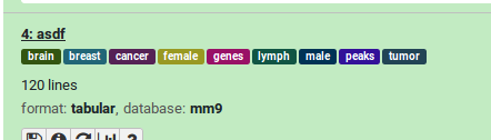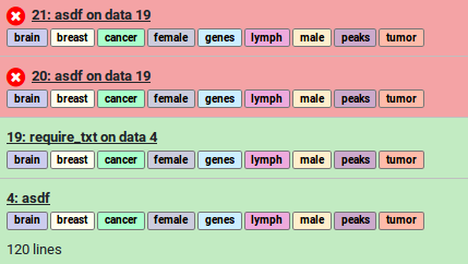 #peaksor#genes, and this wasn't great, they just all looked the same when scanning across a history. (I've added an example at the end.) So I've implemented coloured tags. The colours are done automatically from a hash of the string so they're stateless and consistent.Whole UI: