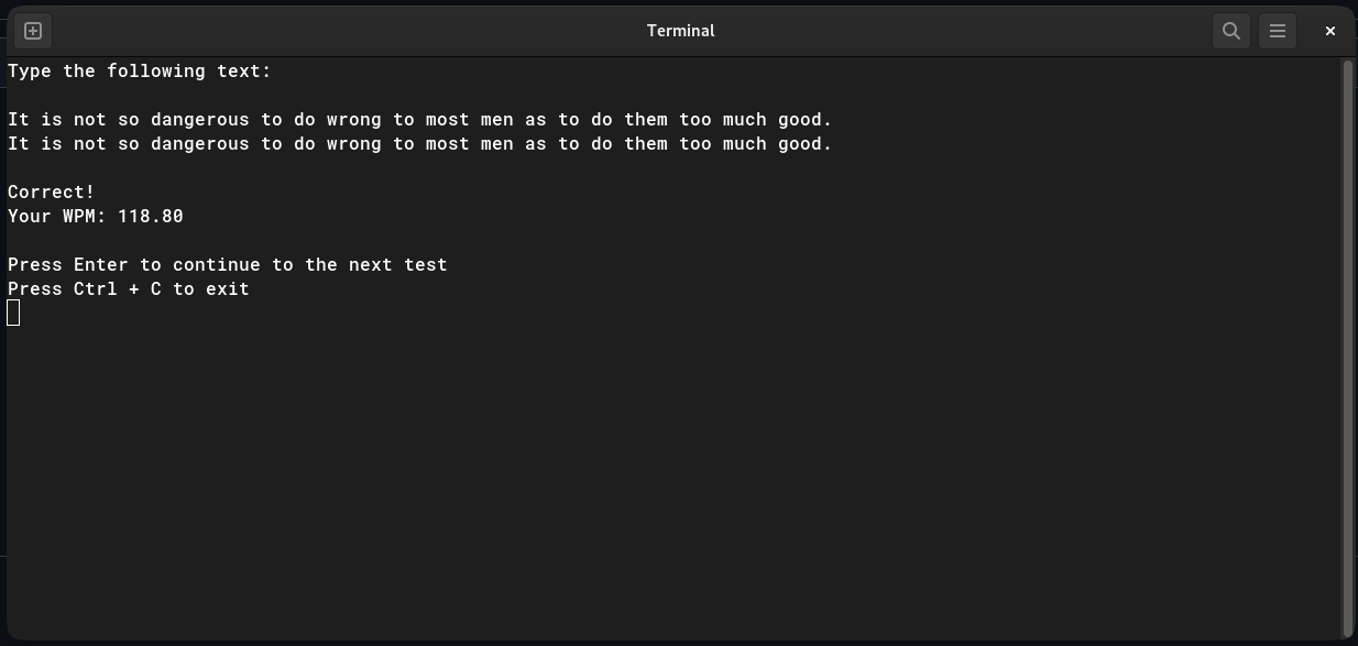 Bashtype is a bash script that functions as a very simple typing test program. To use Bashtype, simply place one's quotes.txt file and bashtype.sh in the same folder, then launch bashtype.sh. By opening this folder in a terminal window and entering the simple command ./bashtype.sh one can quickly and easily launch the program.