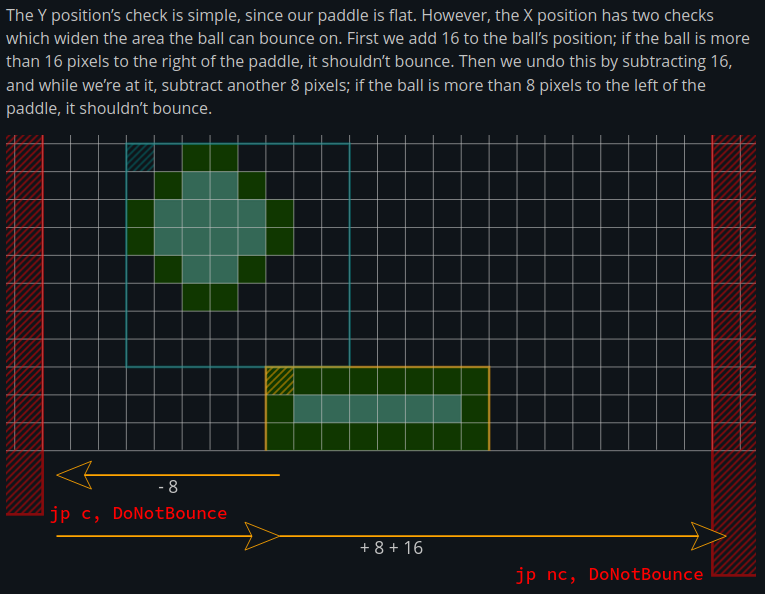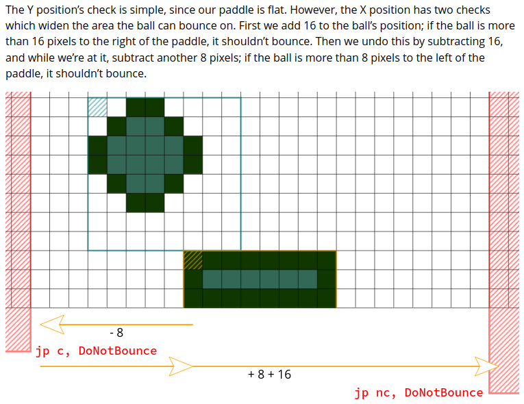 Here are screenshots of the diagram: Maybe it should be clarified that we are considering the position of the ball's top-left pixel, though it is highlighted in the above. And, speaking of, going 16 pixels to the right doesn't seem to make much sense given how wide the paddle appears to be. I dunno. |
