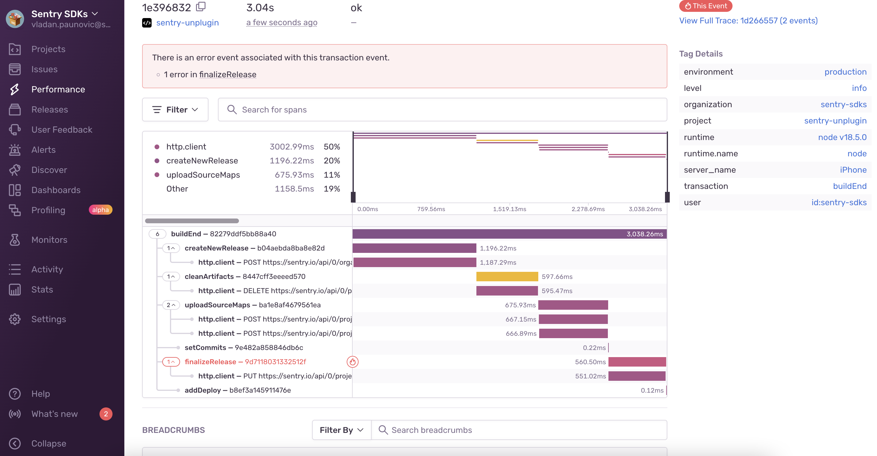 I would have expected to get distributed tracing when making requests to sentry API as we are sending