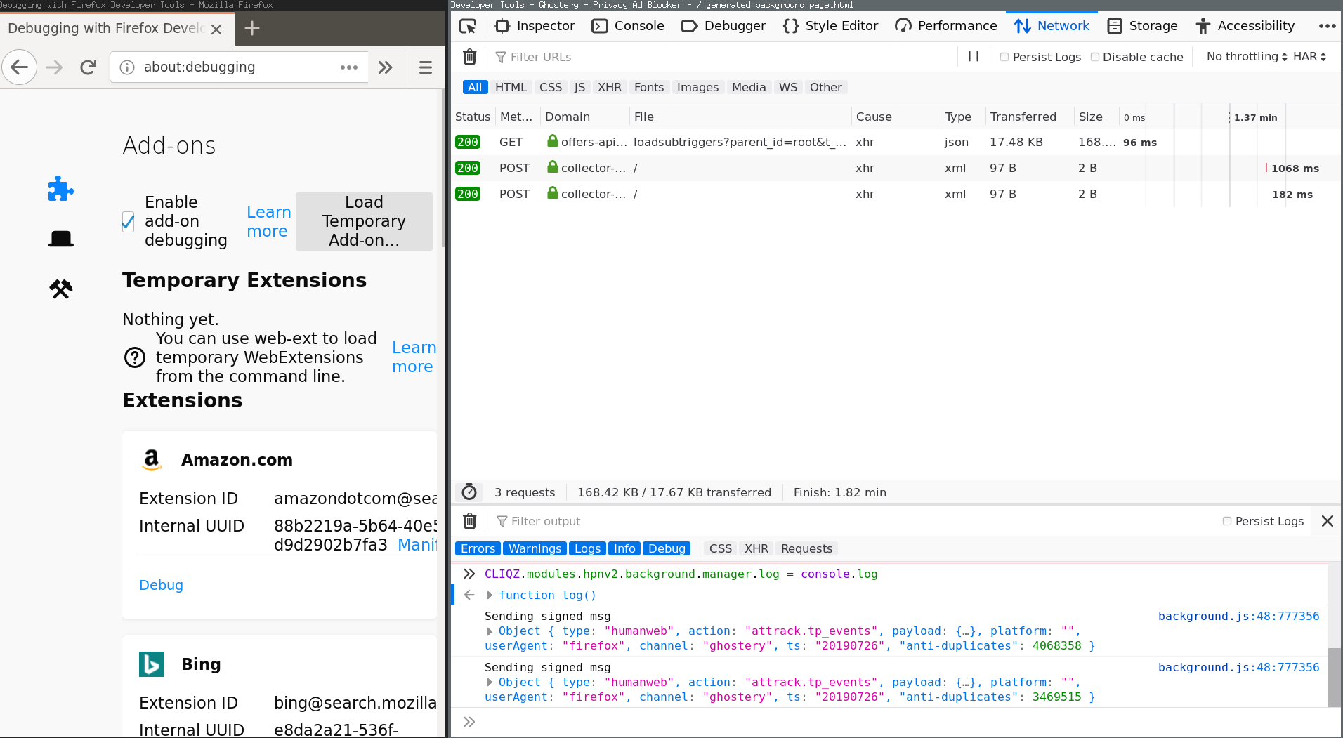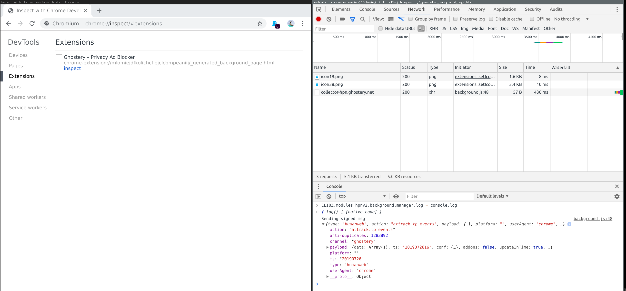 All messages will then be logged and you can inspect them. In addition, you can turn off encryption of the payload with this command: In Cliqz, we send all messages through a 3rd party proxy to strip the sender's IP. That is why we had to add this layer of encryption on top, otherwise the proxy operators could see and modify your data. If it helps to improve the transparency, we could by default turn off this encryption layer if we are not sending through proxies. As said, that feature it is only relevant to prevent a 3rd party (in the anonymization layer) from seeing the traffic. In case of Ghostery, there is currently no reason to have it enabled. I hope that helps you already. But please feel free to ask if you run into problems, or let me know if you have further technical questions. |