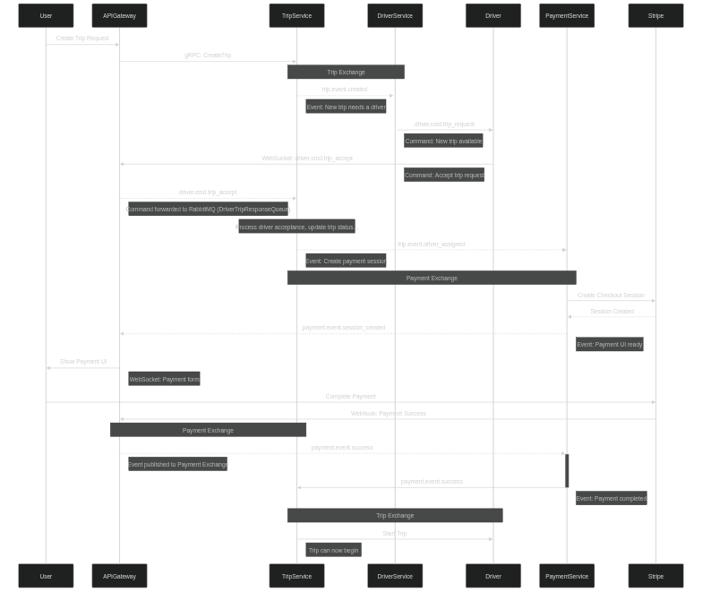 "Microservices with Go" course project Horizontally scalable backend microservice structure using Go, Kubernetes, Docker Project overview This is a backend microservices system for a Uber style ride sharing app from the ground up using Go, Docker and Kubernetes. Trip Scheduling Flow