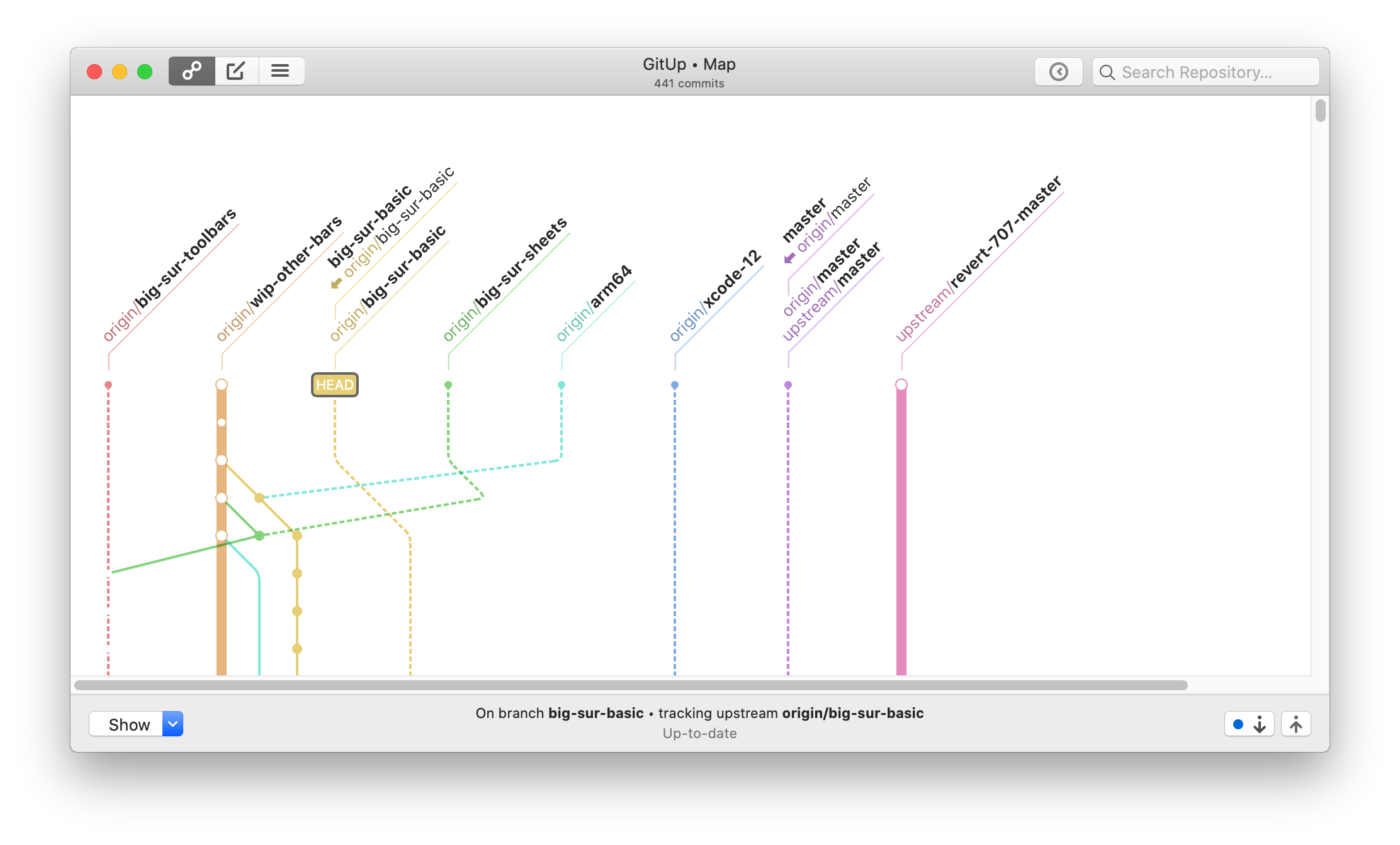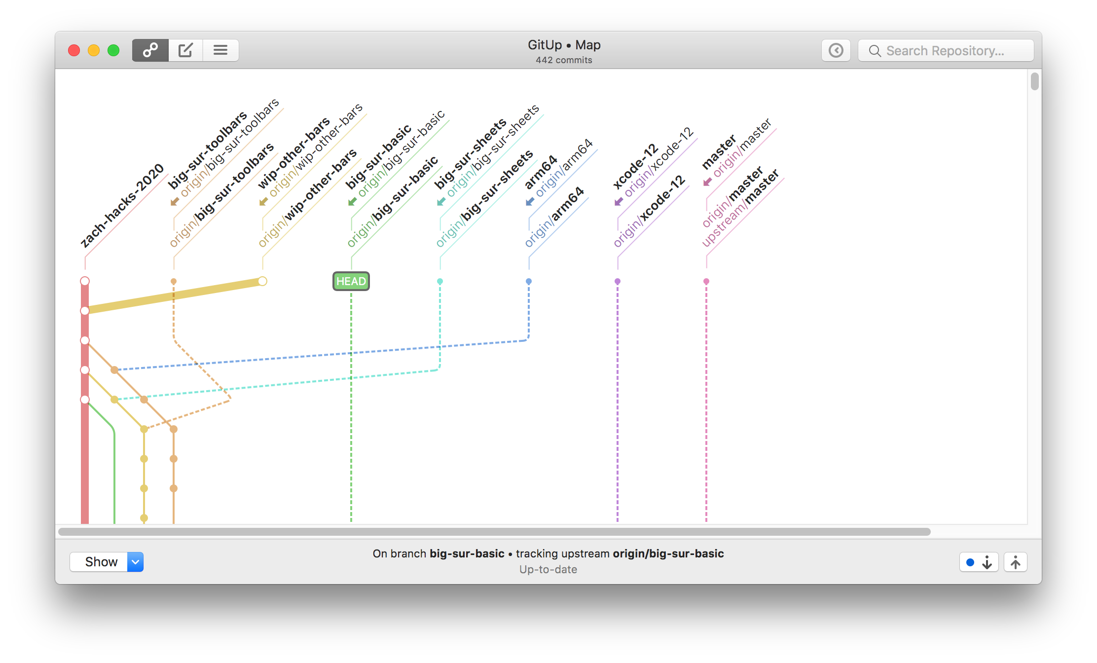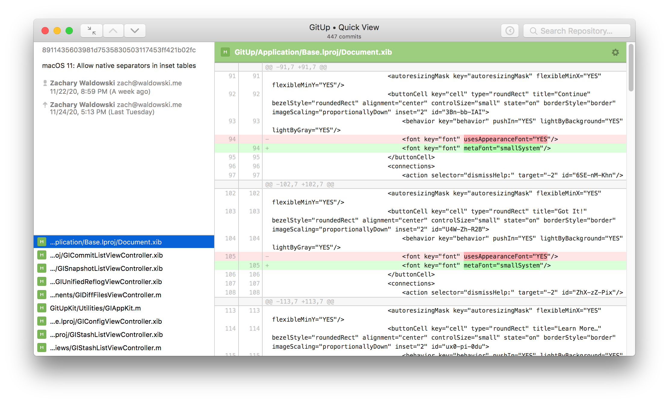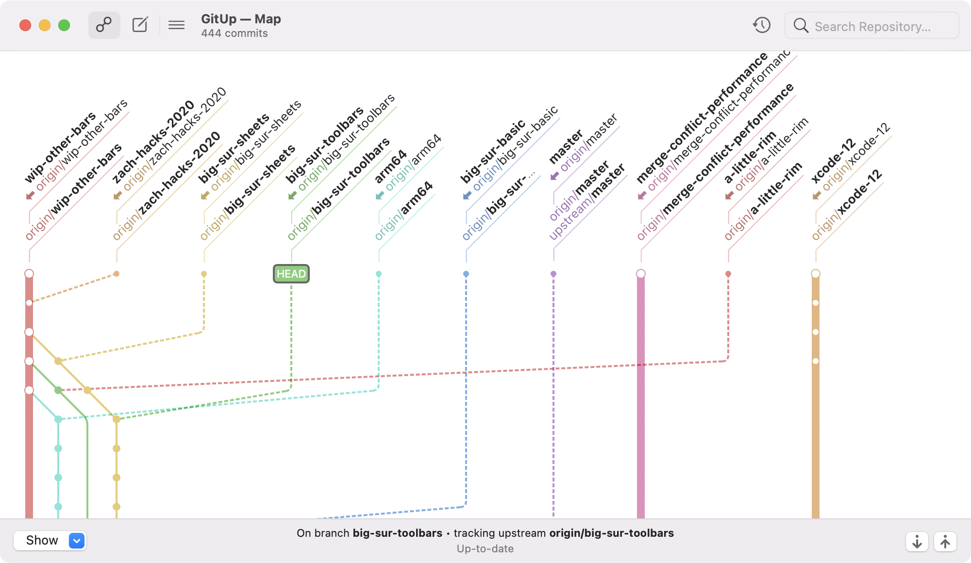 The big change here is reworking the main toolbar to have a fixed layout. The map/commit/stashes control switches to show the up/down/close controls in a Quick View (rather than switching sides of the window), and the snapshots button and search bar disable instead of being hidden. For code complexity’s sake, this applies on 10.15 and below as well. The two-line window title remains as-is on 10.15 and below. This is definitely open to discussion, but it’s been working well for me in a week of daily use.