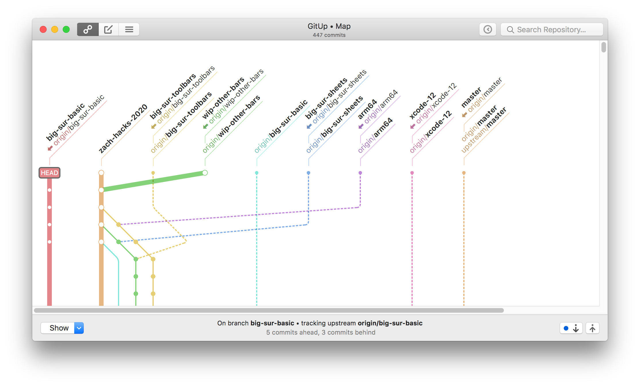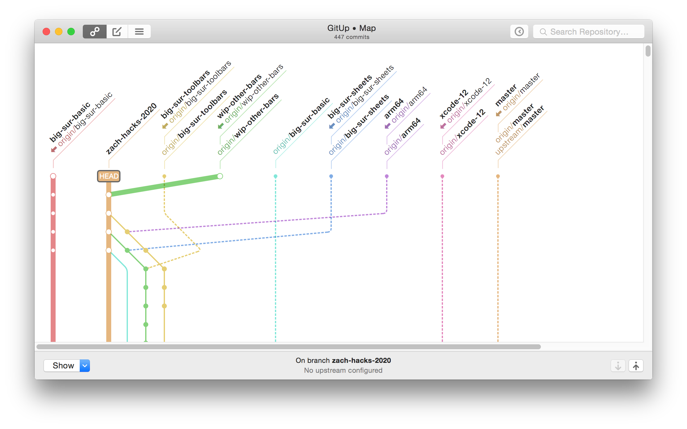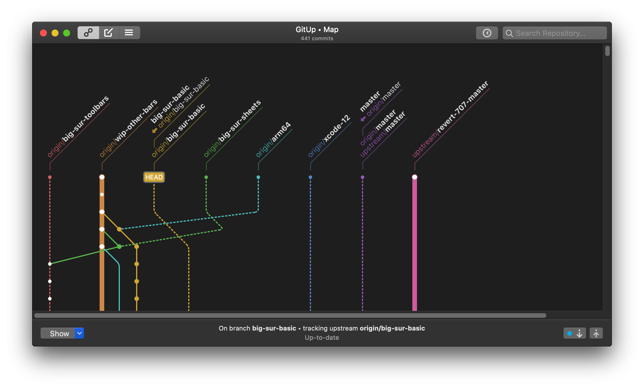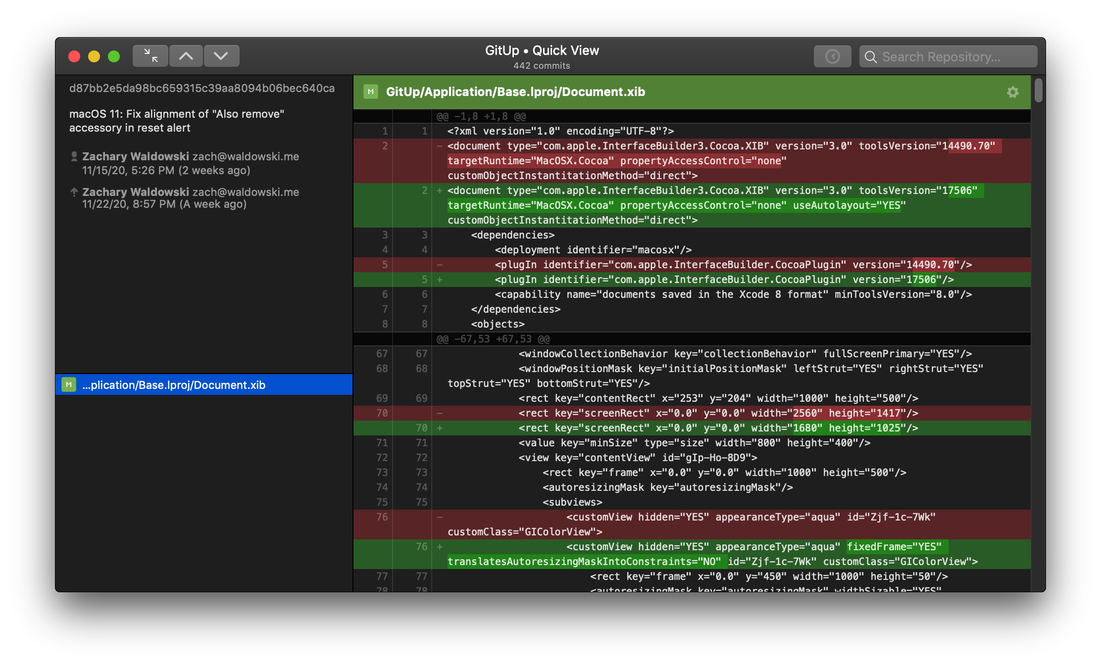 The big change here is reworking the main toolbar to have a fixed layout. The map/commit/stashes control switches to show the up/down/close controls in a Quick View (rather than switching sides of the window), and the snapshots button and search bar disable instead of being hidden. For code complexity’s sake, this applies on 10.15 and below as well. The two-line window title remains as-is on 10.15 and below. This is definitely open to discussion, but it’s been working well for me in a week of daily use.