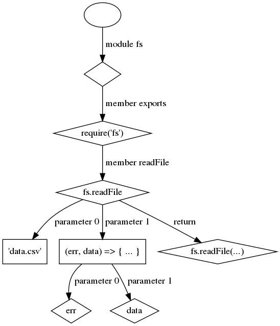 errparameter is the 0th parameter of the (callback passed as) 1st parameter to memberreadFileof the exports of modulefs, so its access path is/module fs/member exports/member readFile/parameter 1/parameter 0(your notation may vary).When the API graph is a tree, as in this case, it is just a representation of a (finite) set of access paths. In general, however, API graphs can be DAGs or even completely general graphs with cycles. In the former case, a single node can have multiple access paths, and in the latter it can even have infinitely many access paths. Put another way, API graphs represent a possibly infinite set of access paths, and encode aliasing relationship between them.