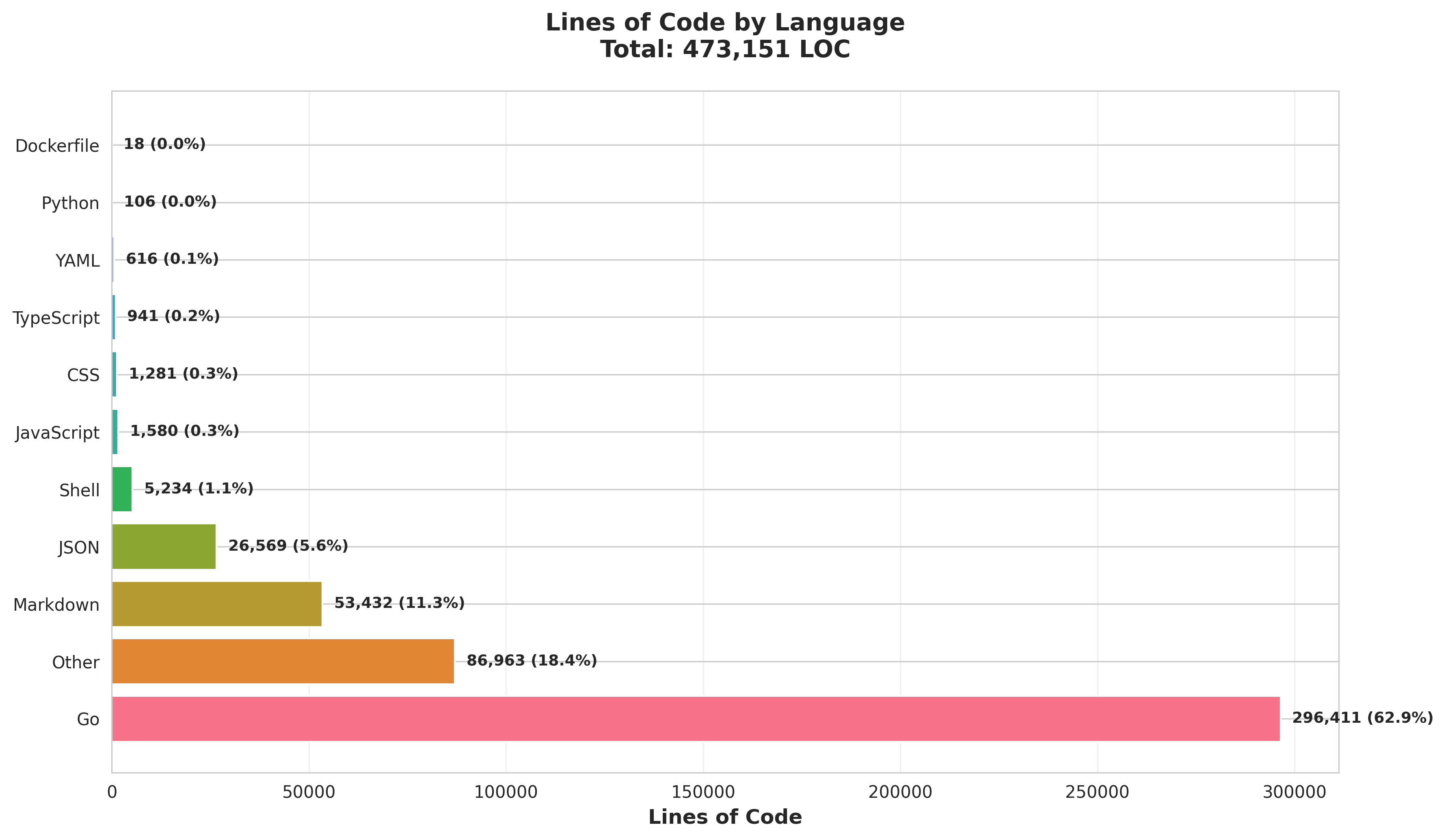 The codebase is heavily Go-based (296,411 LOC, 62.9%), with significant "Other" category files (86,963 LOC, 18.4%) likely including compiled workflows. Markdown documentation comprises 11.3% (53,432 LOC), showing good documentation investment.