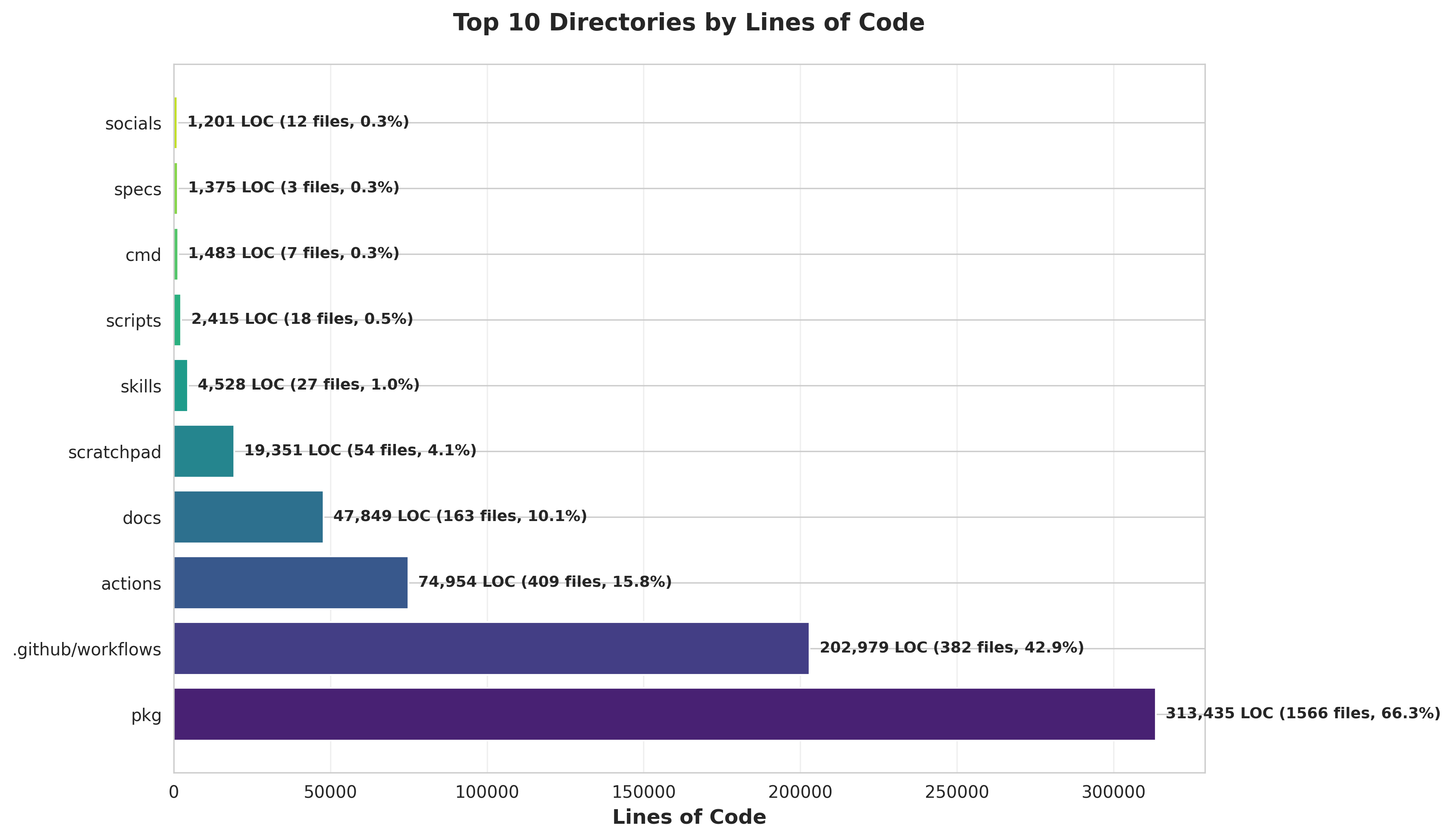 The pkg directory dominates with 313,435 LOC (66.3%), followed by .github/workflows with 202,979 LOC (42.9%). The actions directory contains 74,954 LOC, indicating significant reusable action infrastructure. This distribution reflects a well-organized monorepo structure.