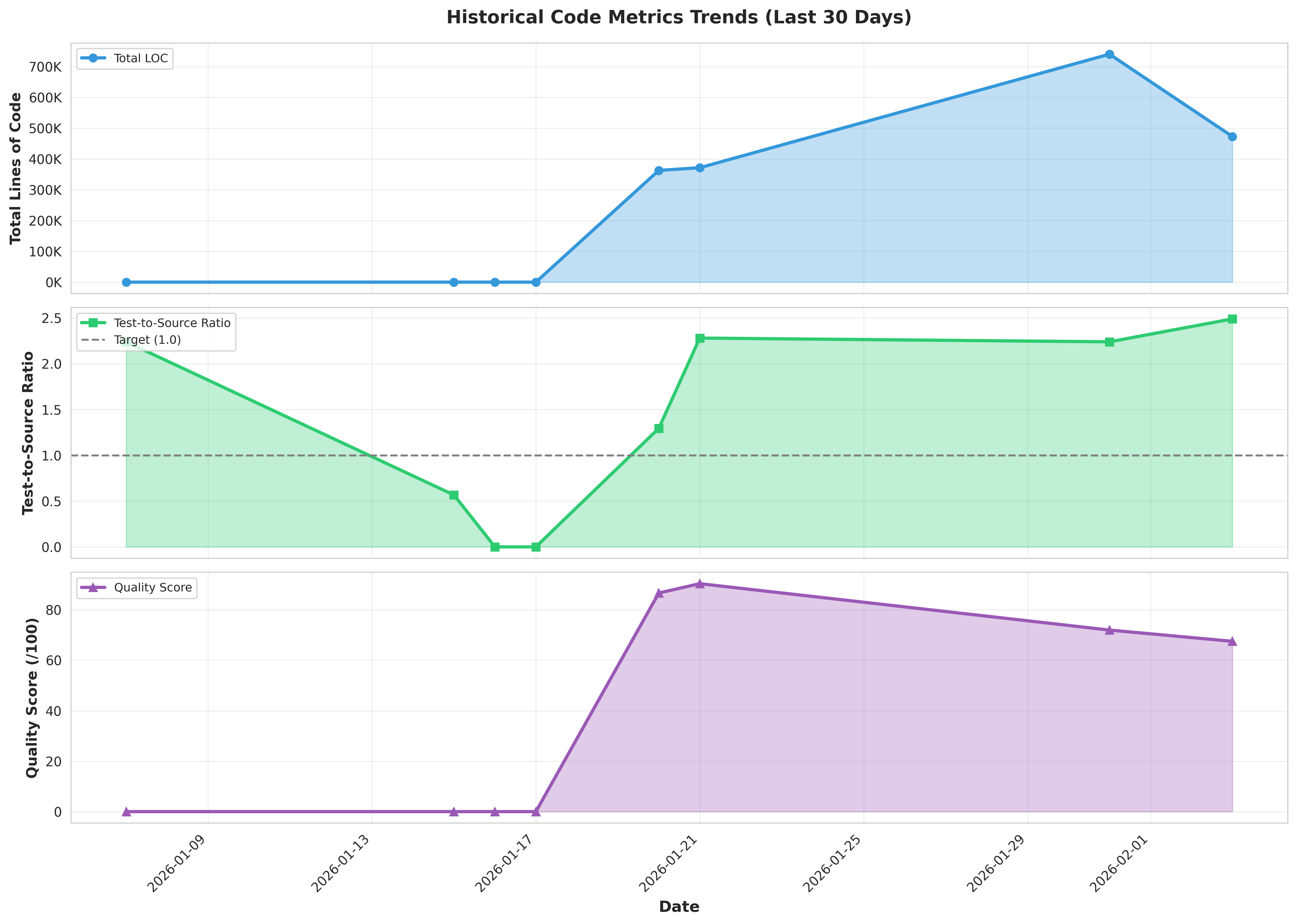 The 30-day trend analysis reveals fluctuating codebase size with recent stabilization around 473K LOC after previous peaks near 800K. Test-to-source ratio has improved and stabilized at 2.49:1. Quality scores show recent improvement trend, reaching 67.6 from previous lows.