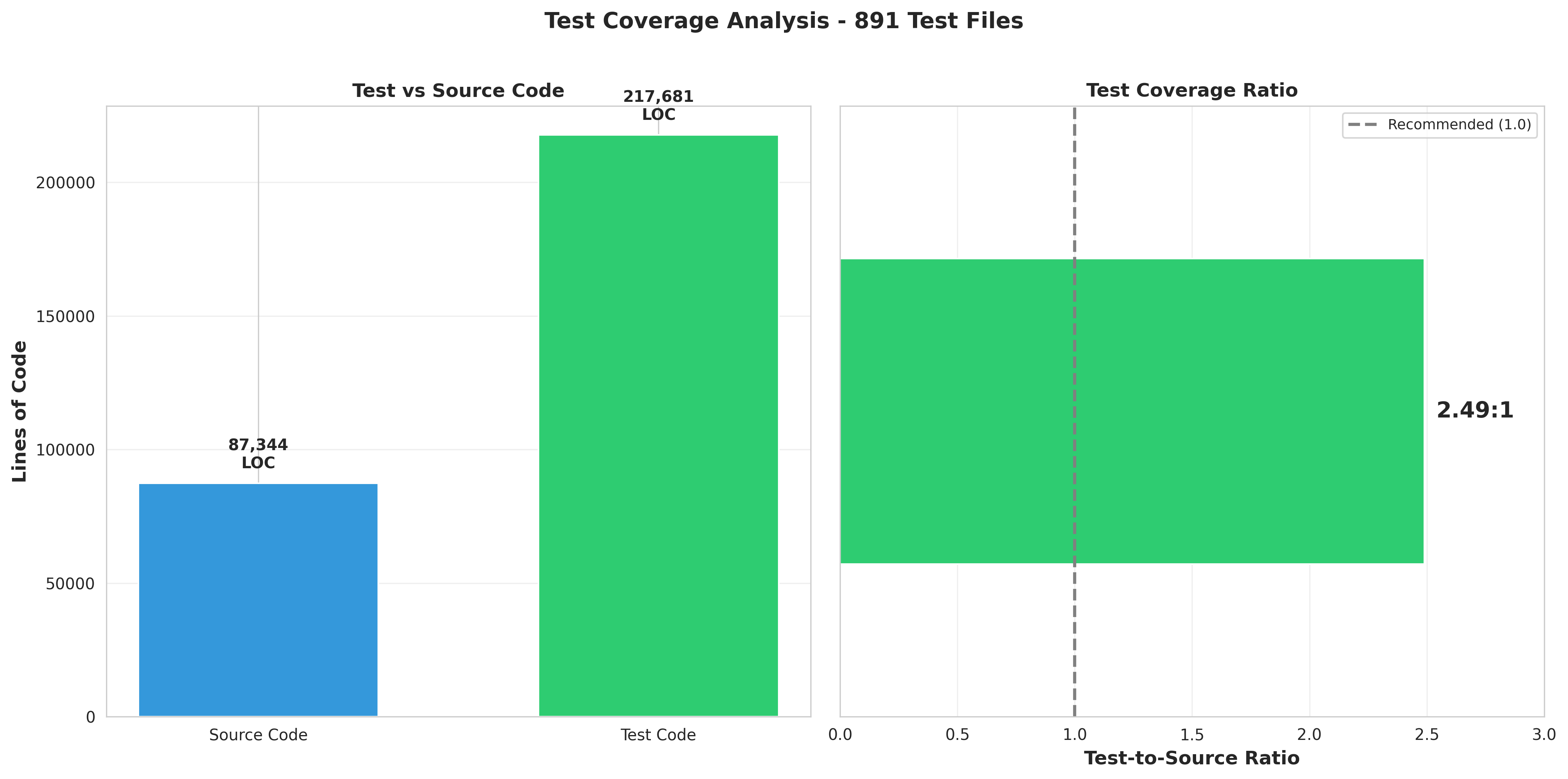 With 891 test files containing 217,681 LOC compared to 87,344 LOC of source code, the repository achieves an impressive 2.49:1 test-to-source ratio. This exceeds the recommended 1.0:1 ratio, demonstrating exceptional commitment to test coverage and code quality.
