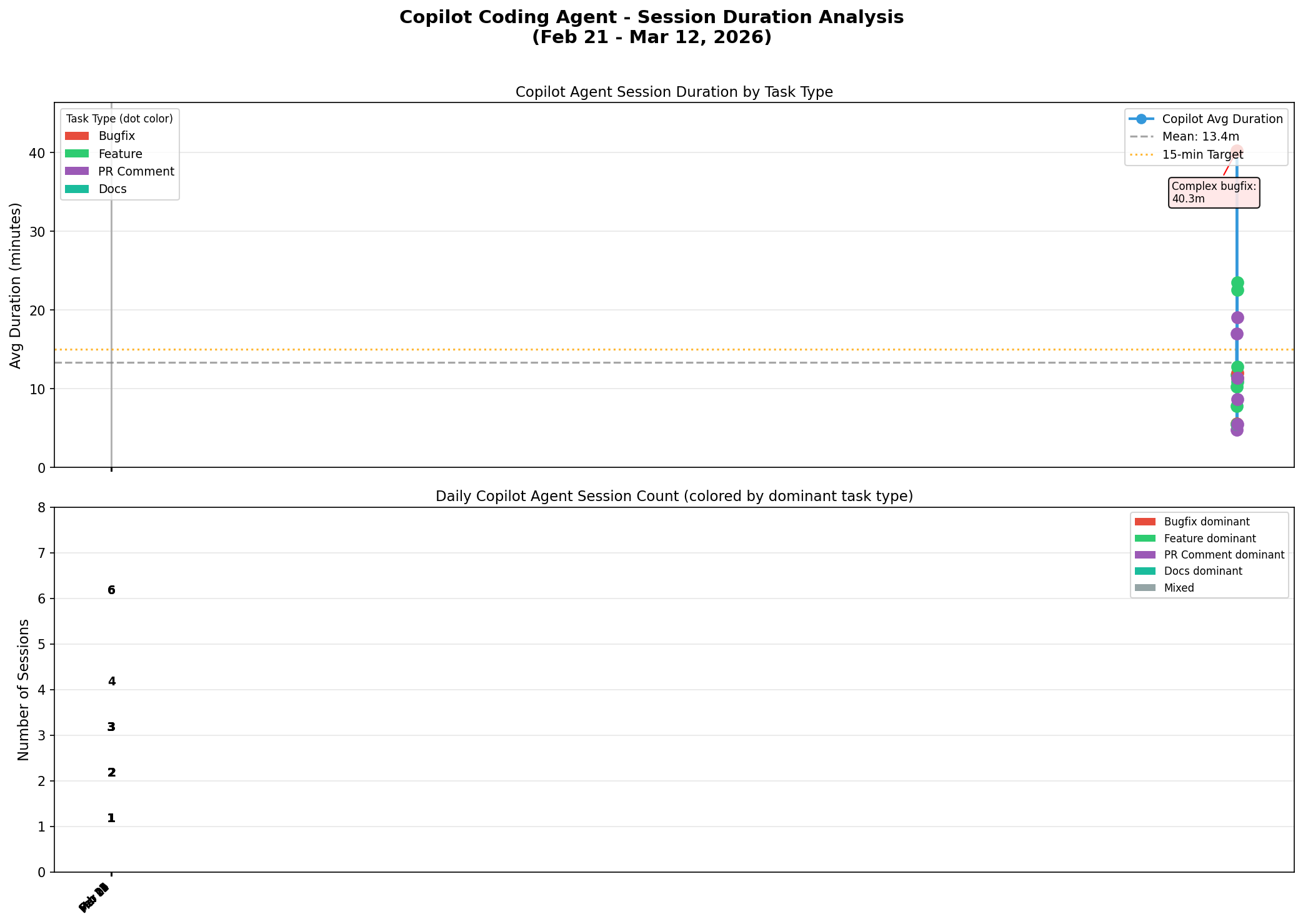 Average session duration remained stable in the 5–23 minute range with one outlier at 40.3 minutes (Feb 27 — complex bugfix). PR comment response tasks show a healthy convergence pattern with duration decreasing across iterations (19.3m → 10.8m).