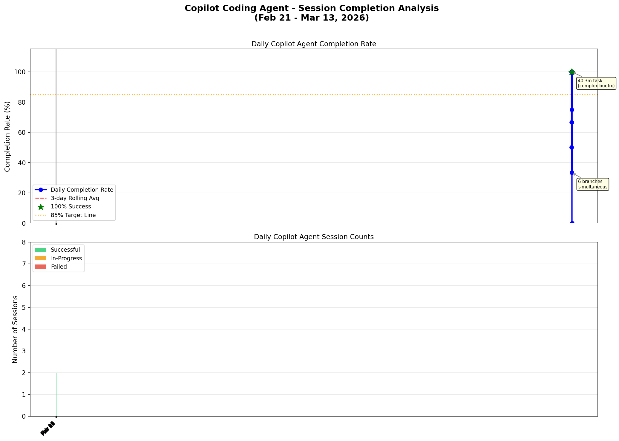 Completion performance was consistently excellent across the analysis window. Feature and documentation tasks drove the high success rate, while the 9 in-progress sessions at snapshot time reflect normal pipeline latency rather than failures.