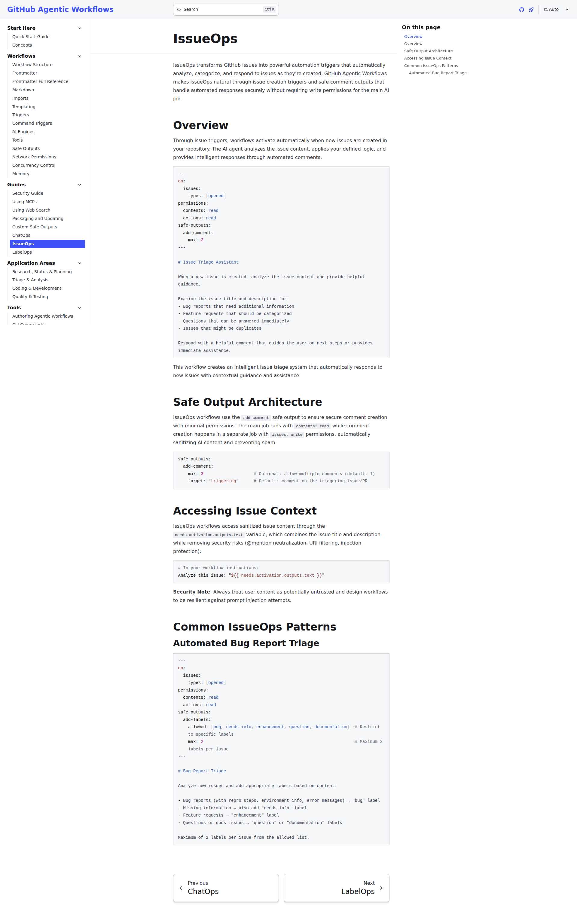 | IssueOps workflows use the `add-comment` safe output to ensure secure comment creation with minimal permissions. The main job runs with `contents: read` while comment creation happens in a separate job with `issues: write` permissions, automatically sanitizing AI content and preventing spam: | |