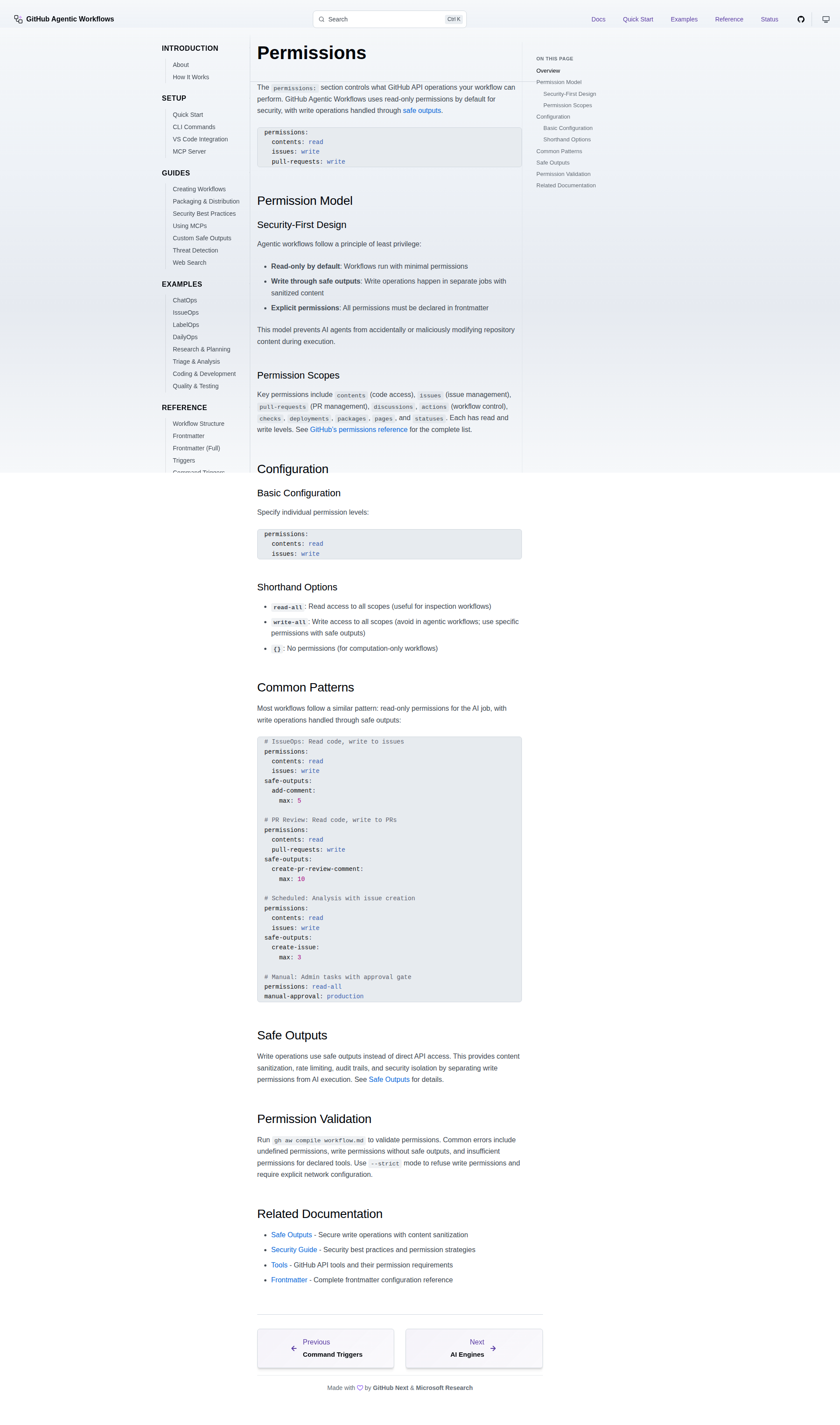 | docs/src/content/docs/reference/permissions.md | Streamlined permissions documentation by removing verbose tables, consolidating workflow examples, and converting repetitive sections to concise prose |