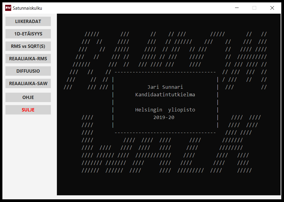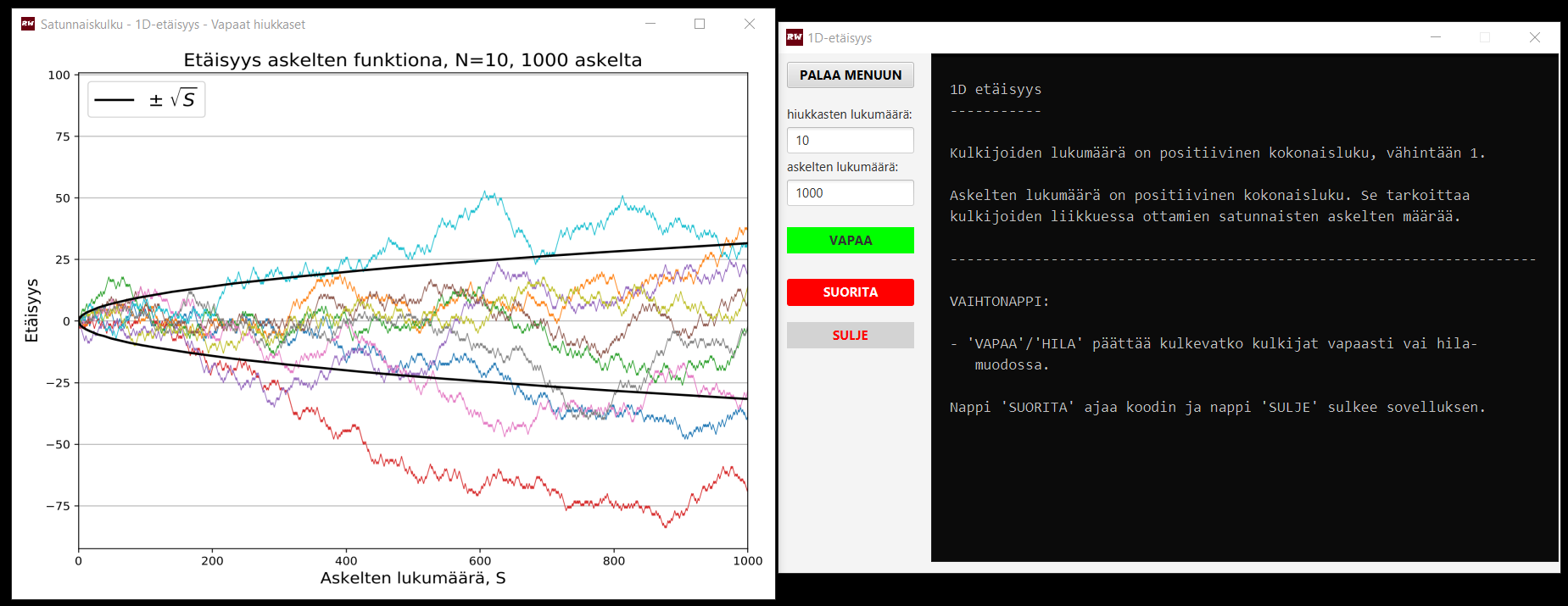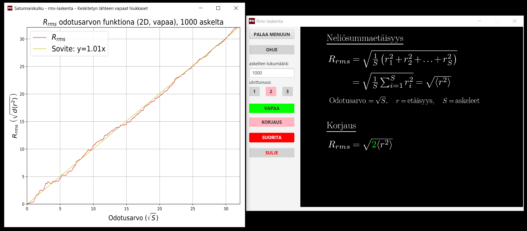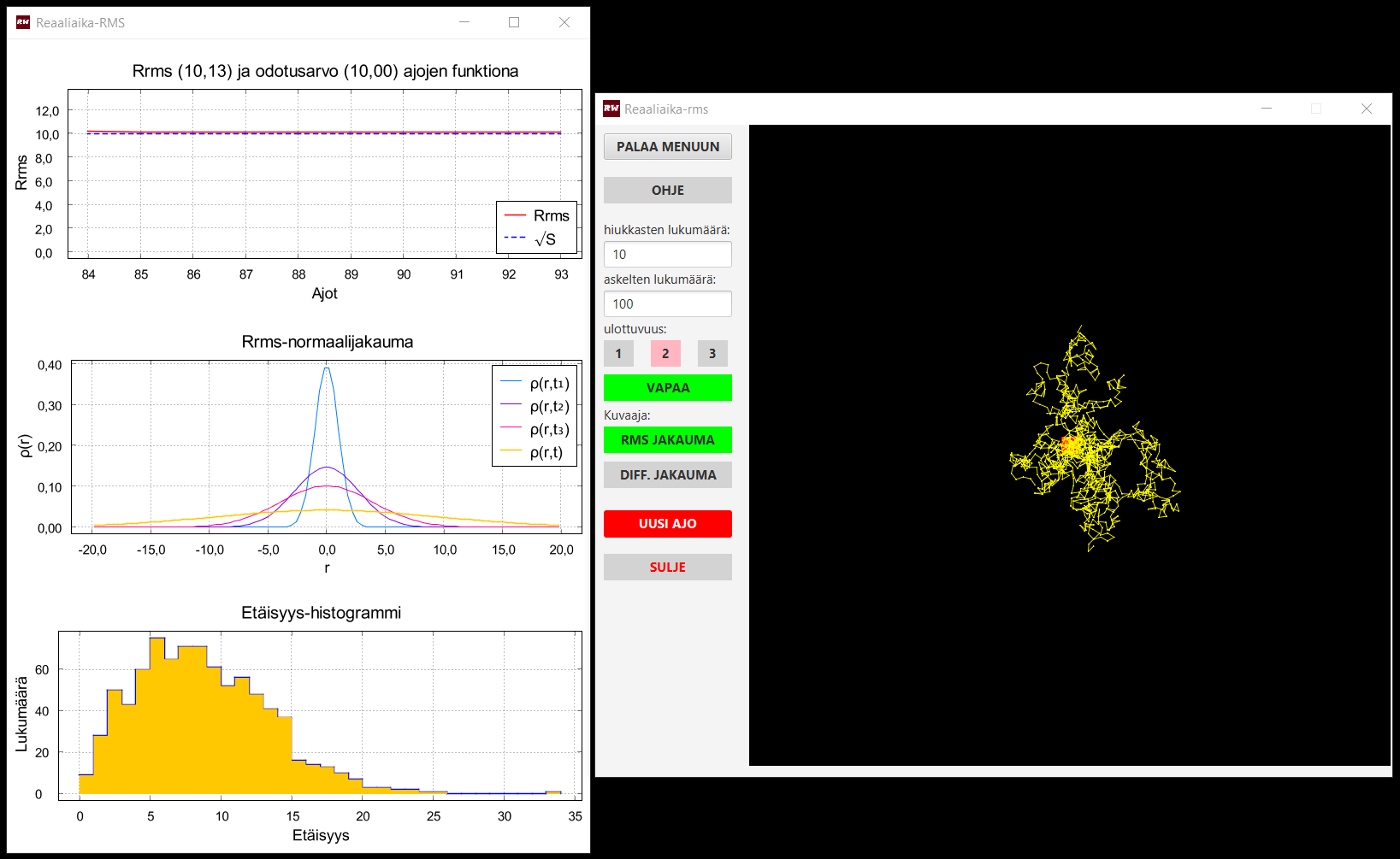 | REAALIAIKA-RMS | esittää reaaliaikaisen animaation satunnaiskulkijoista, jotka luodaan yhdestä pisteestä (fixed source). Ohjelma silmukoi kulkijoita halutulla askelmäärällä, laskien samalla neliöllistä keskiarvoetäisyyttä, jonka normaalijakauma esitetään grafiikkana. Toinen grafiikka esittää sekä neliökeskiarvoetäisyyden että odotusarvoetäisyyden sqrt(S). Mitään tiedostoja ei tallennu automaattisesti, mutta käyttäjä voi halutesaan tallentaa kuvan eri muodoissa klikkaamalla kuvaa hiiren oikealla korvalla. Tallennusvaihtoehtoja ovat png, jpg, bmp, gif, svg, eps ja pdf. |