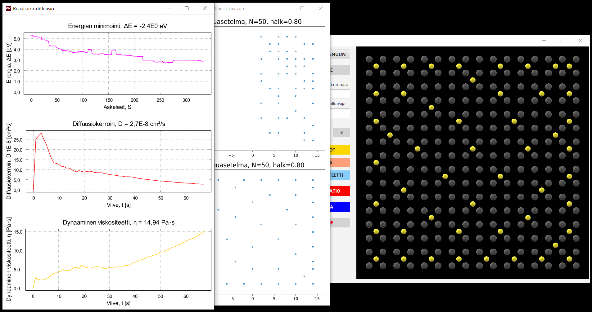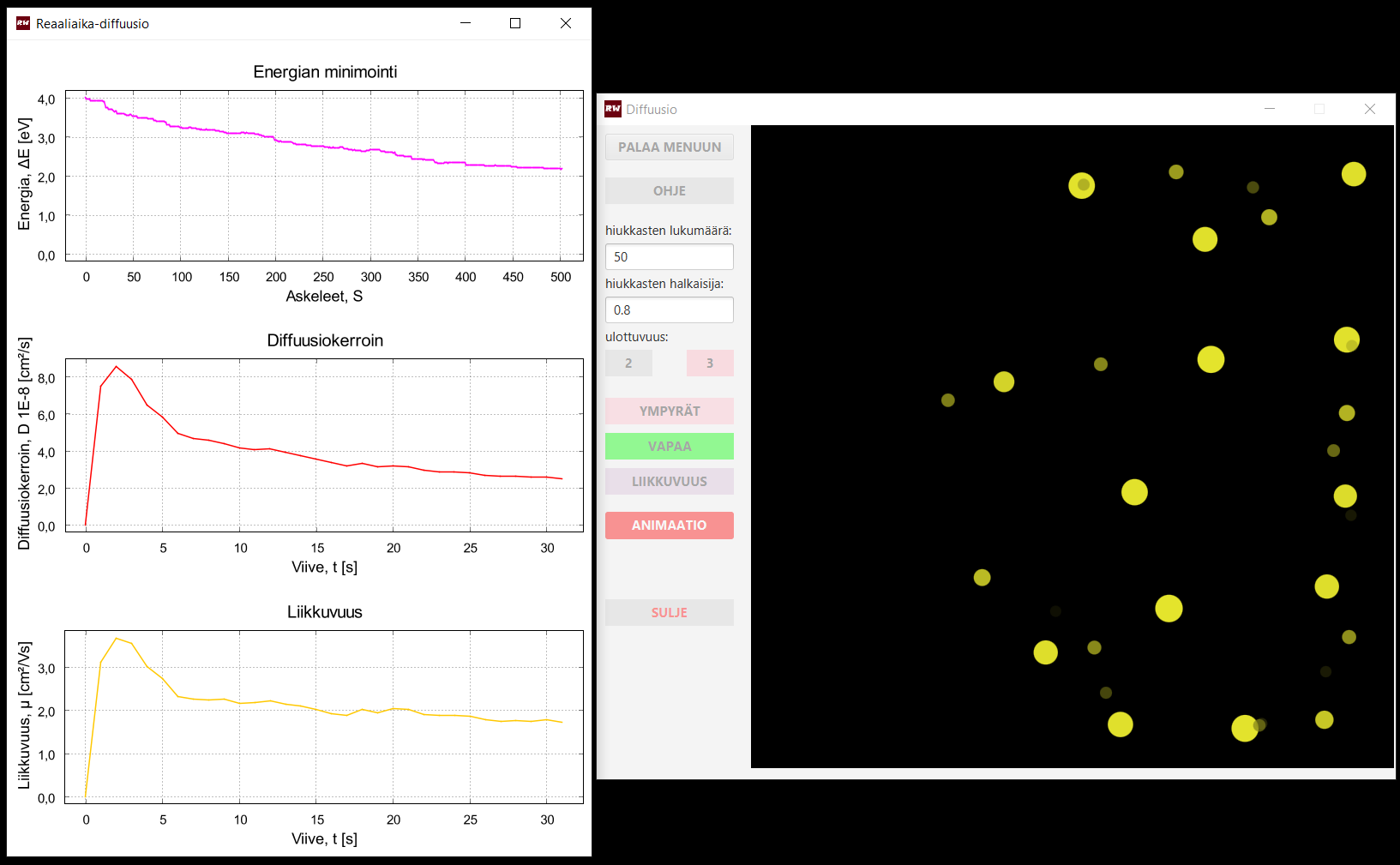 | DIFFUUSIO | esittää vaihtoehtoisesti joko animaation satunnaiskulkijoiden diffuusioliikkeestä tai kuvan kulkijoiden aloitus- ja loppukonfiguraatioista. Animaatio tuottaa ajoa varten tarvittavan datatiedoston aloituskonfiguraatiosta .xy-päätteellä. Kuvia ei tallennu. Kuvan suorittaminen sen sijaan tuottaa kaksi .xy-päätteistä datatiedostoa. Kuva tallentuu pdf-muodossa automaattisesti. |