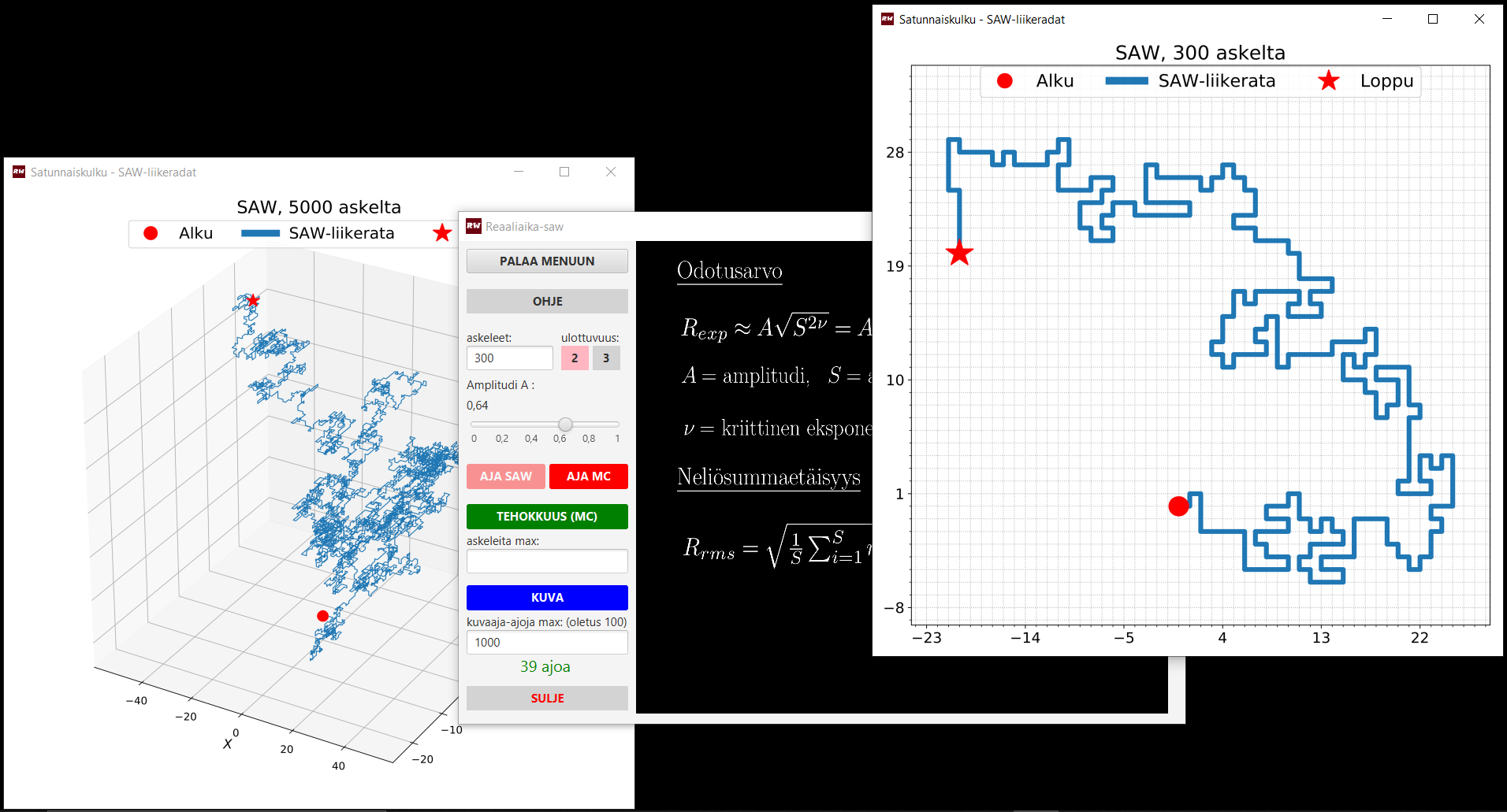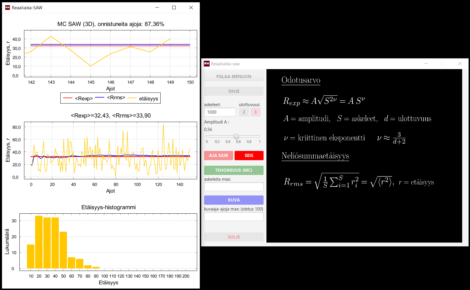 | REAALIAIKA-SAW | esittää itseään välttelevää satunnaiskulkua vaihtoehtoisesti joko reaaliaikaisilla kuvaajilla neliöllisestä keskiarvoetäisyydestä yms. tai yhden liikeratakuvan. Myös reaaliaikainen tehokkuuskuvaaja on valittavissa. Reaaliaikaiset ajot eivät tuota tiedostoja. Liikeratakuva tuottaa yhden liikeratadatatiedoston .xy-päätteellä sekä kuvan pdf-muodossa. |