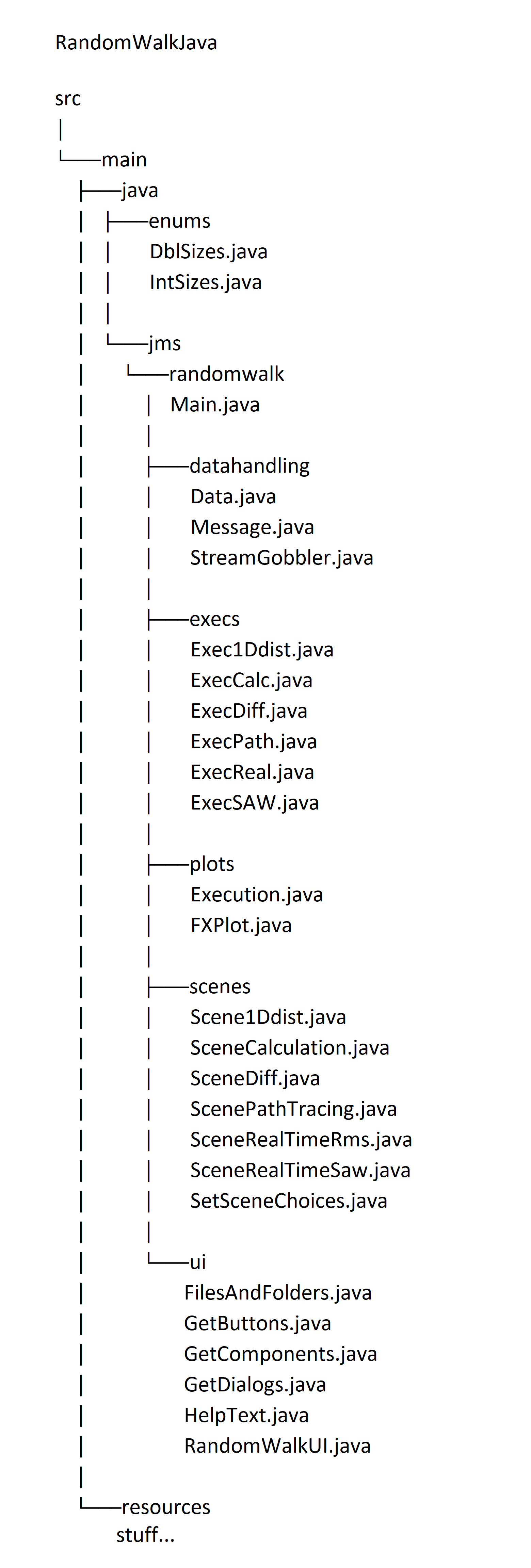 Java-ohjelma suorittaa erilaisia satunnaisliikeskenaarioita esittäen niiden perusteella eri tyyppisiä kavioita ja/tai animaatioita. Ensimmäisen kerran käynnistettäessä ohjelma luo työkansion C:/RWDATA, johon Fortran- ja Python-koodit tallentuvat. Tämän jälkeen data- ja kuvatiedostot tallentuvat samaan paikkaan.