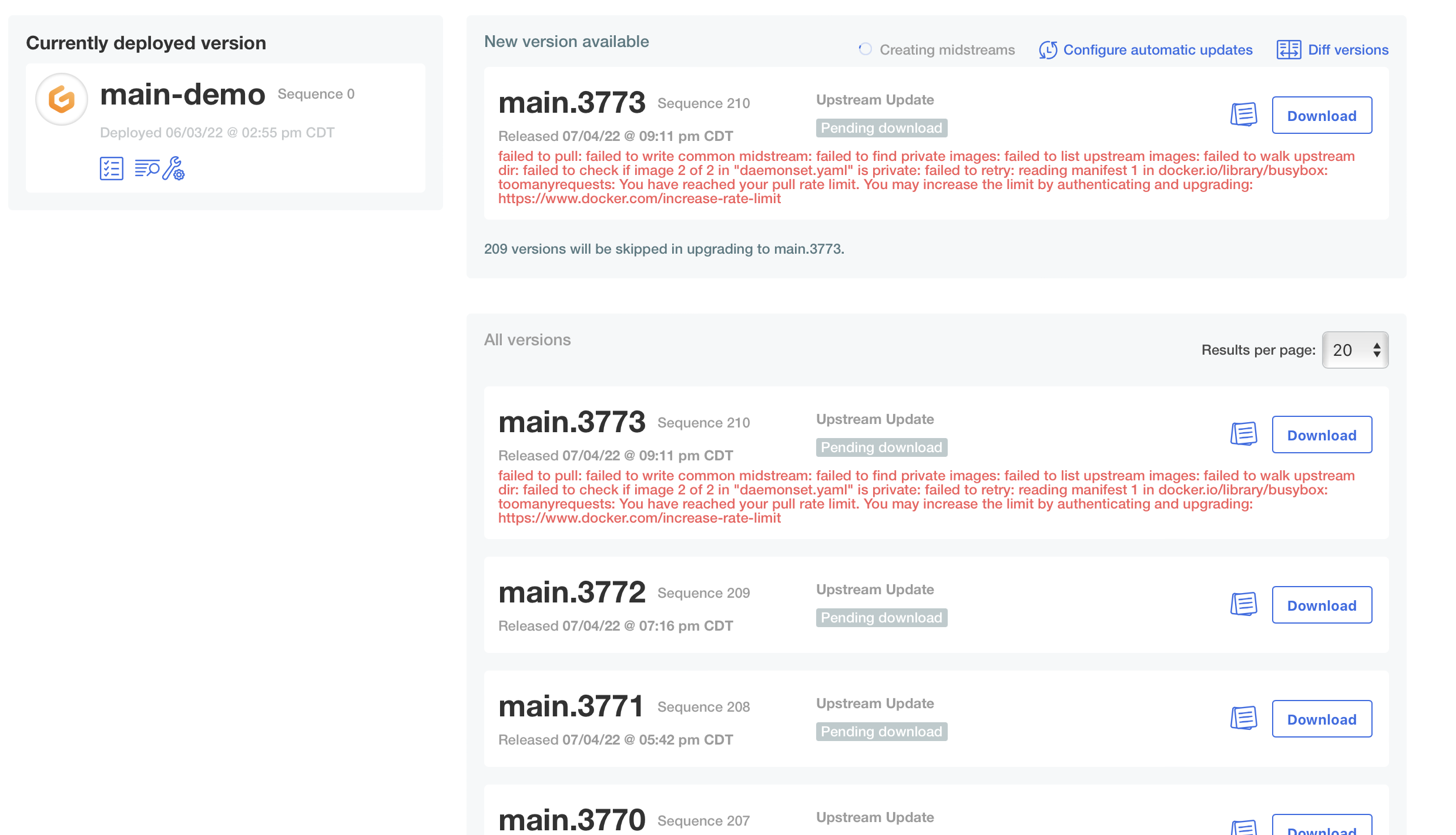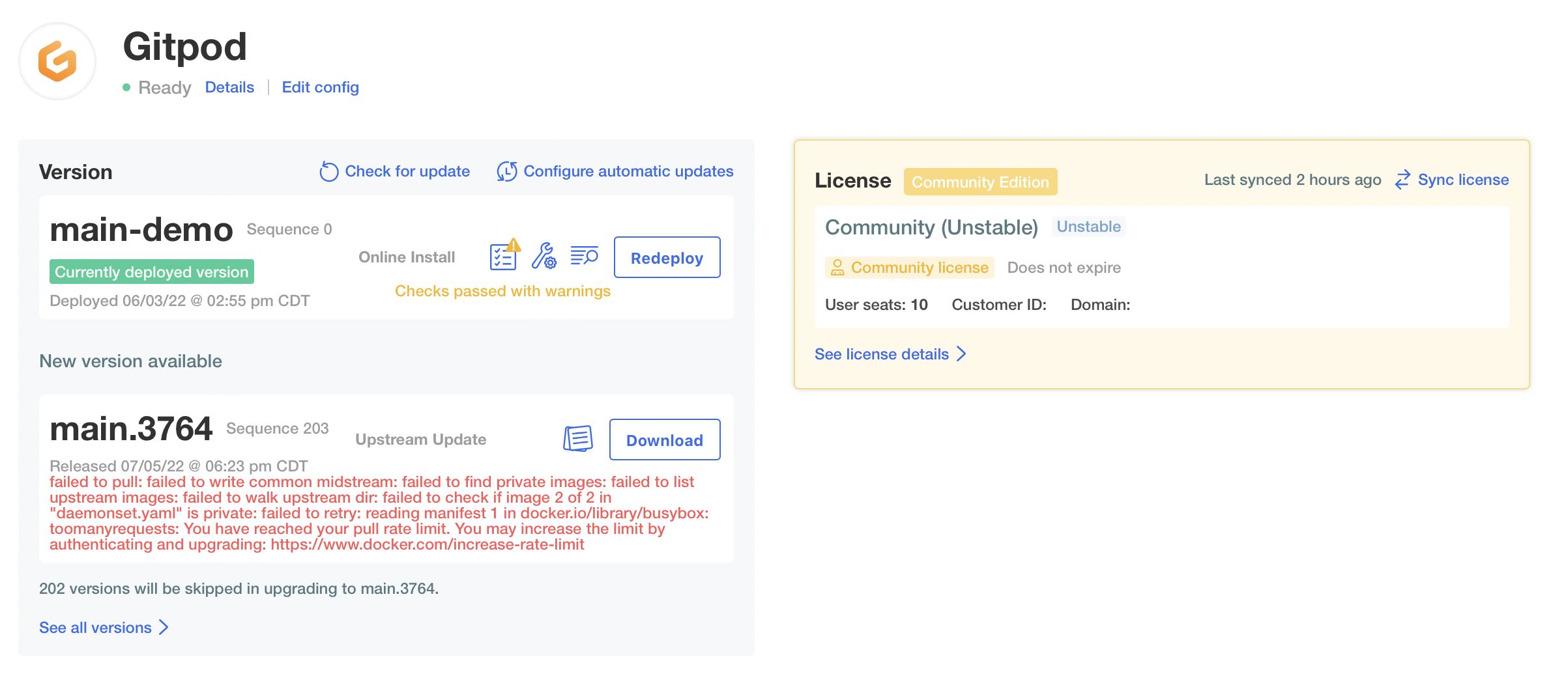 This evening I've attempted to update a Gitpod instance I have but that has been offline for a few months. This instance is using Unstable. It appears when I shut it down it was at release-2022.04.1.2. Bringing it back online this evening I believe it was running preflight checks on all releases since then up until main.3791` - or at least it attempted too. Unfortunately it looks like Docker has rate-limited me so I am unable to deploy the latest version. In fact I can't deploy any version since some of our pods use images hosted at Docker Hub so I have to wait 6 hours. 😫