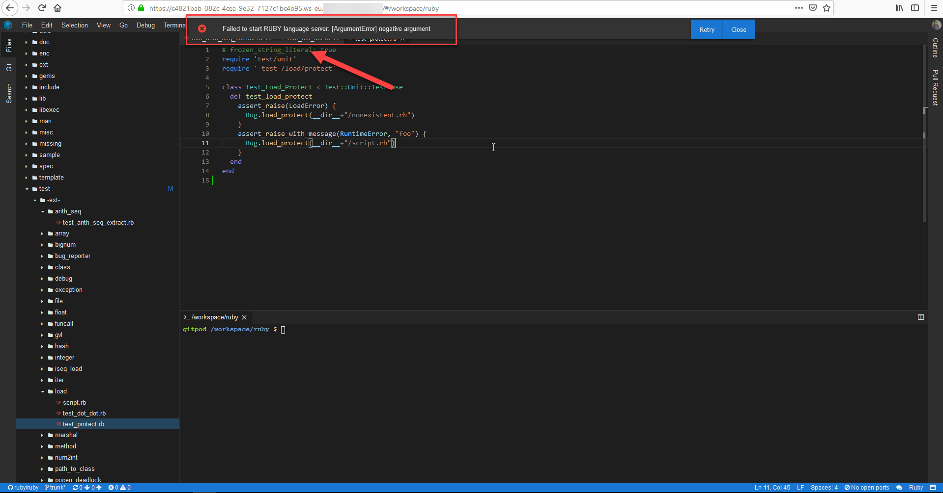 - Pay attention to the "Failed to start RUBY language server" error