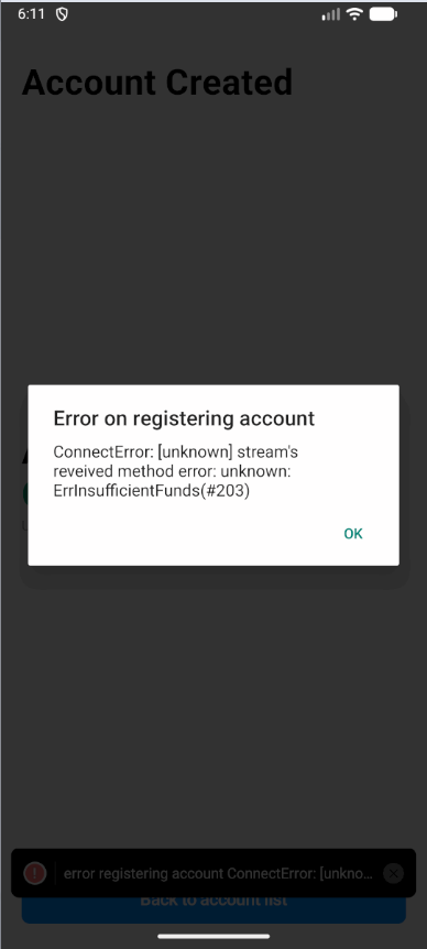 It shows an error, but the account appears as successfully created - even though the name isn’t actually registered on-chain.