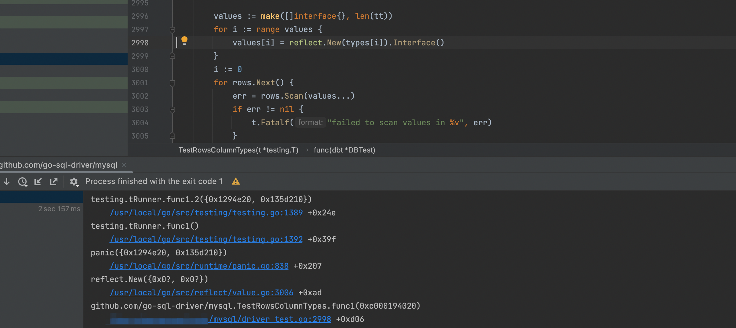 When running the TestRowsColumnTypes unit test on OceanBase, I encountered a panic and the test progress was forced to exit.