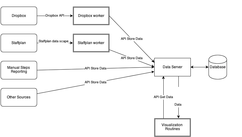 Worker components are in charge of retrieving data from different services (eg. Bodymedia, Fitbit, Withings, Dropbox, Staffplan...) and storing the data in the central database.