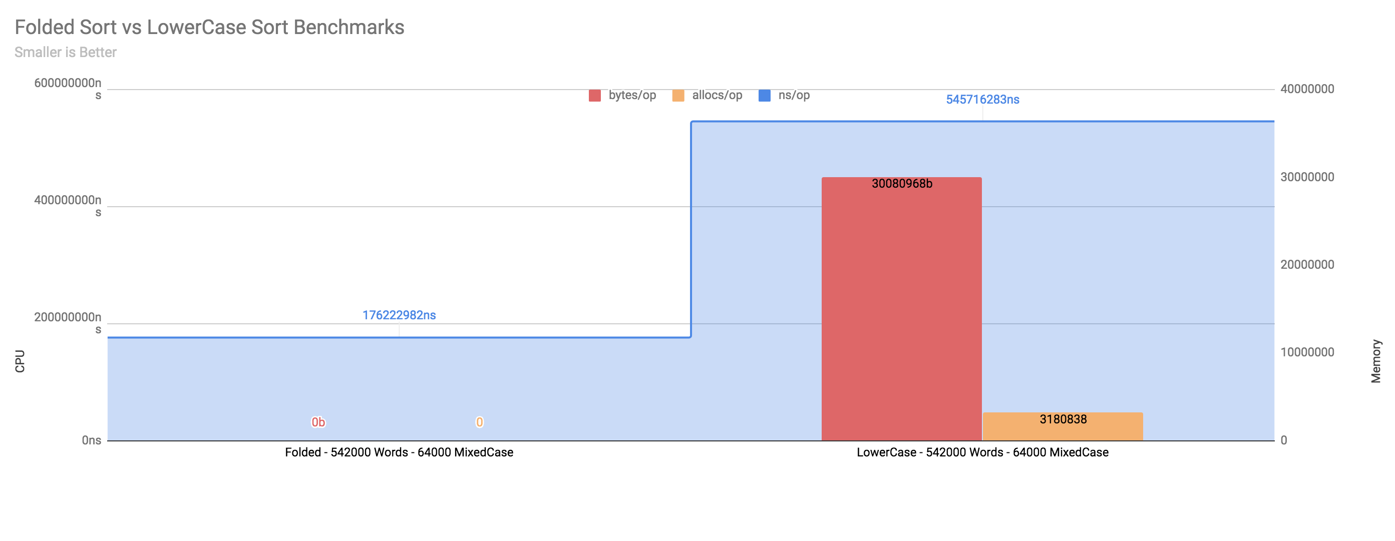 I recently wrote a blog post about the overwhelming performance increase that comes with sorting a slice of strings in a case-insensitive manner using an implementation of CompareFold. For example:
