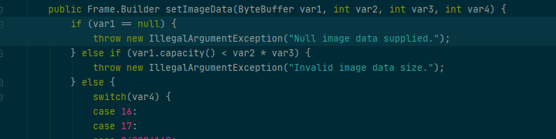 The analyzer calls the onFailure callback function and logs this exception which is first thrown in the com.google.android.gms.vision.Frame class although I didn't manage to understand which part of my code is behaving wrong because most of the classes are decompiled and have obfuscated variable names (var2, var5, zza)