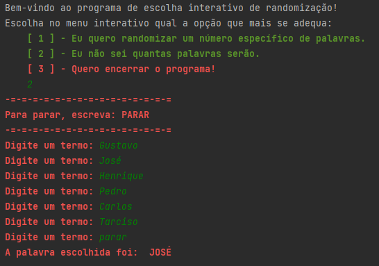 Como visto no exemplo acima, o código irá pedir para o usuário qual a opção desejada. Após inserir a opção, você será questionado quanto as palavras que quer inserir, logo após, verá o resultado escolhido pela biblioteca Random, nativa do Python.
