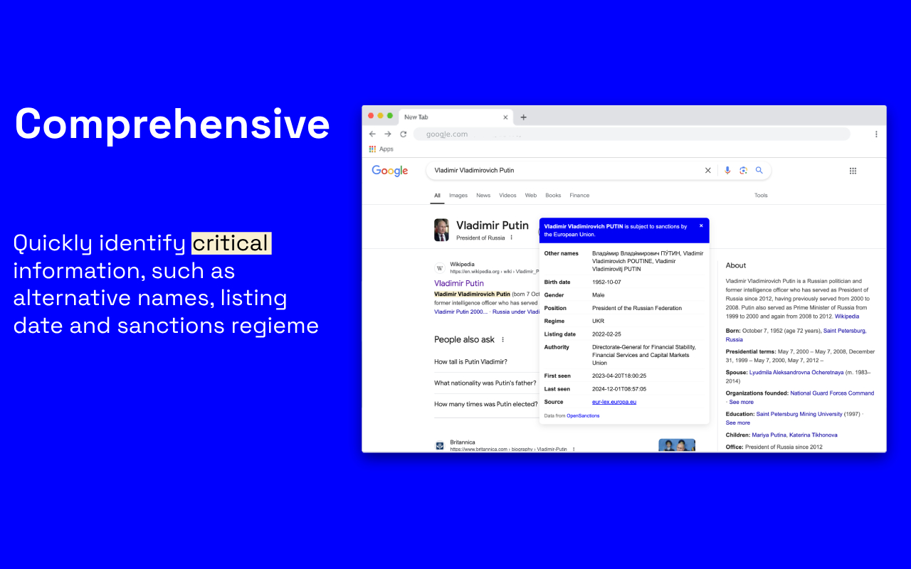 The extension automatically highlights names of sanctioned individuals and organisations subject to EU sanctions, drawing upon the latest available data from OpenSanctions and provides critical insights such as: