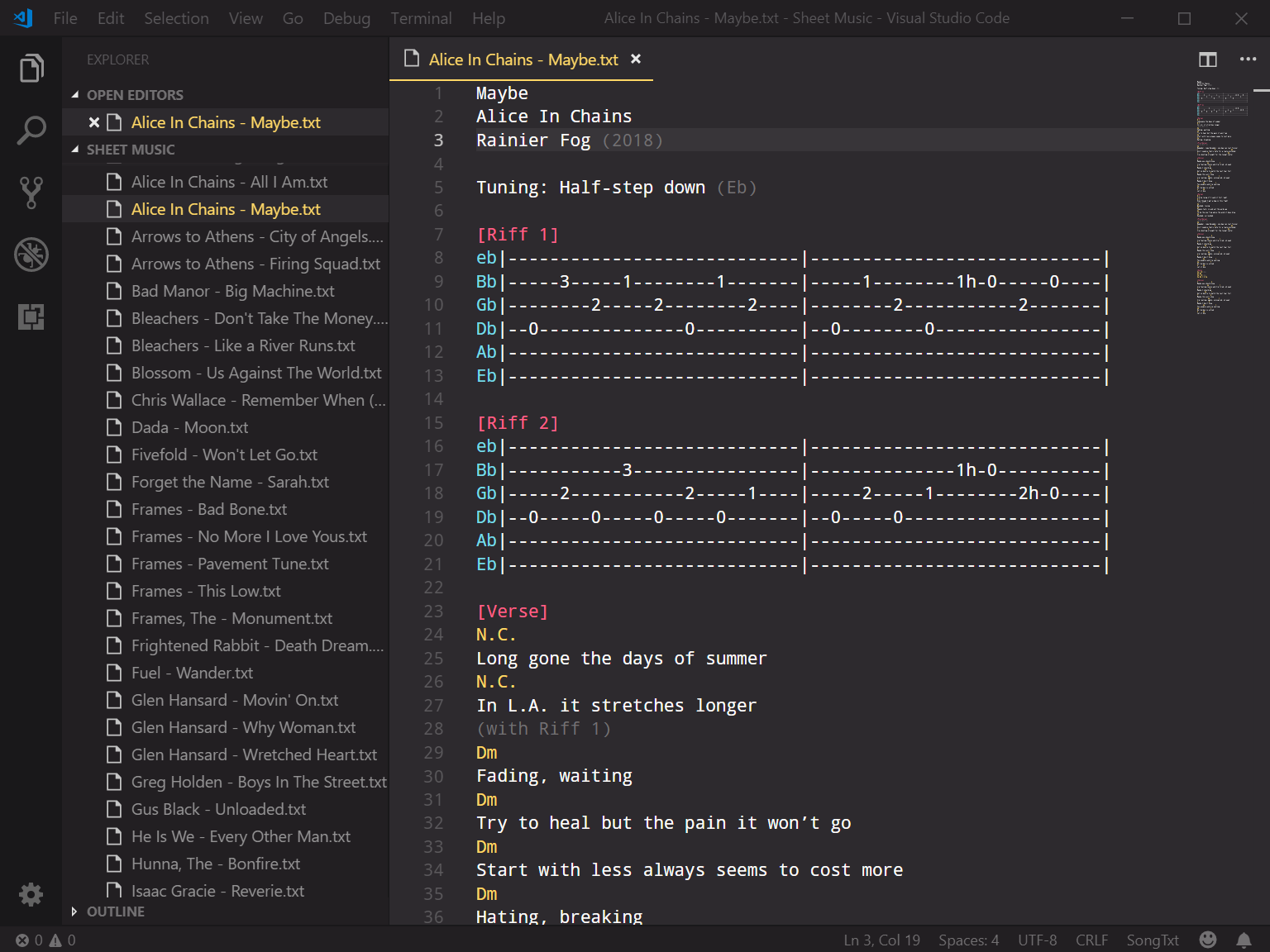 SongTxt is a simple Visual Studio Code extension that improves the experience around typing in music transcriptions in plain text files. It is built to follow the formatting guidelines used by Ultimate Guitar.