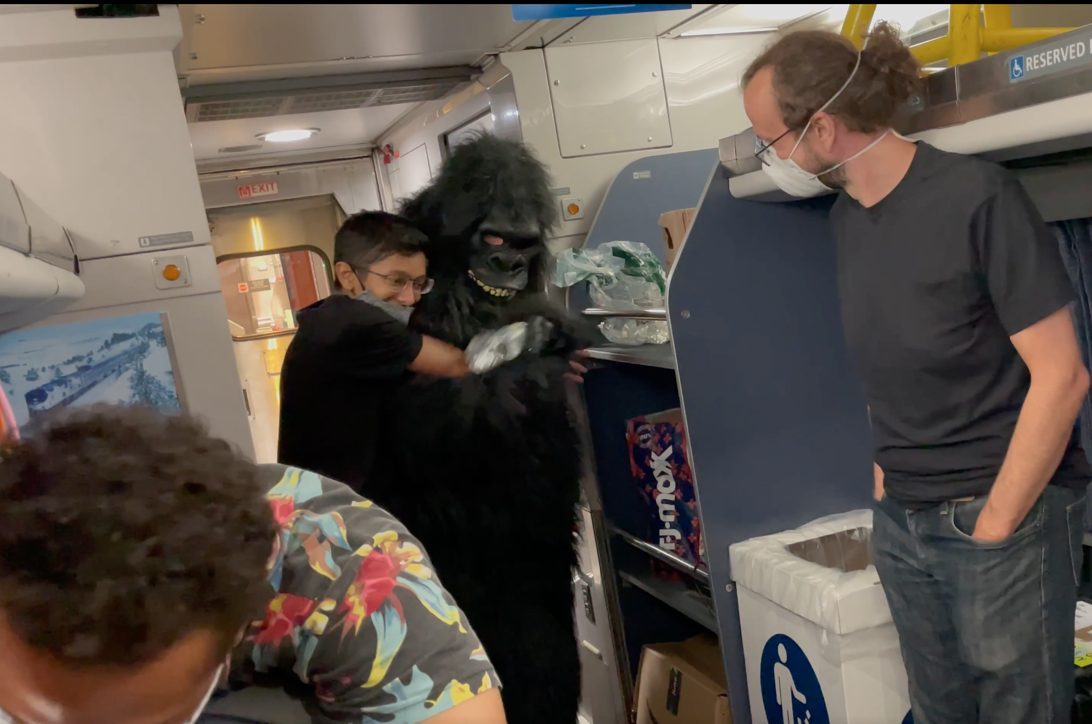 So, naturally, we called up every weirdo, artistic, out-of-the-box thinker that we knew. Our first call was to Woody Keppel, an incredible actor and performer, and professional clown. Woody brought in Jeremy Holm (IMDB), who would later storm down the isles of an Amtrak coach in an ape suit with Woody in hot pursuit, as a zookeeper, among other things.