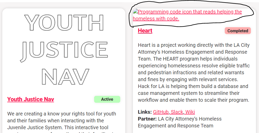 We need to fix the project picture visible for Heart on the HfLA Projects webpage. The project picture is visible on the project webpage for Heart but it is not visible on the HfLA projects webpage. Sharing screenshots below, for reference