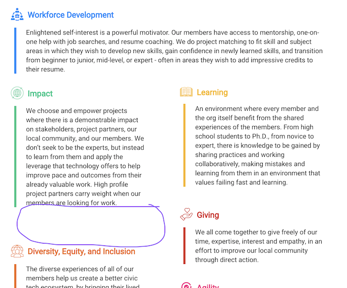 We need to align the colorful platform items on the second page card from the top, left column more evenly to keep visual consistency on the About Us page