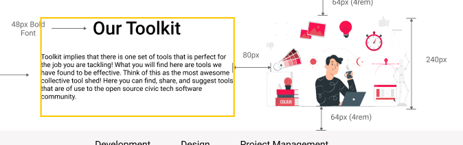 I worked with Josh Bubar on the sccs for the toolkit page; we made a few changes to what was originally planned. We made some design decisions about the margins in the mobile view and we set the breakpoint at 850px instead of 479px. Please let me know what changes I should make. |