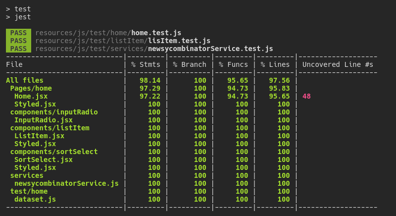 To execute the testing in the front end, run npm test. A report with the coverage and some useful information will be shown in the terminal. These tests are located in the resources > js > test folder.