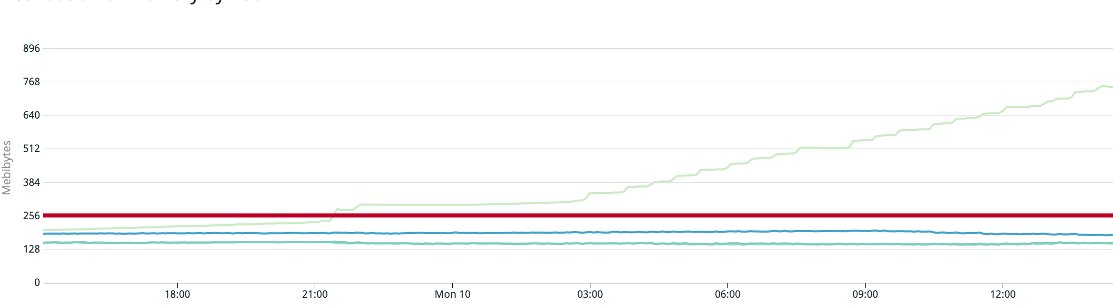 The light green line is the problematic Pod. Red is the CPU request, and the other lines are the other Pods from this Deployment of the ingress controller which were functioning normally.