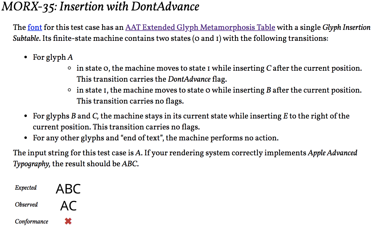 When handling `morx` insertion, the `DontAdvance` flag isn’t handled as expected. See [test case MORX-35](https://rawgit.com/unicode-org/text-rendering-tests/master/reports/FreeStack.html#MORX-35). CoreText is passing this test.