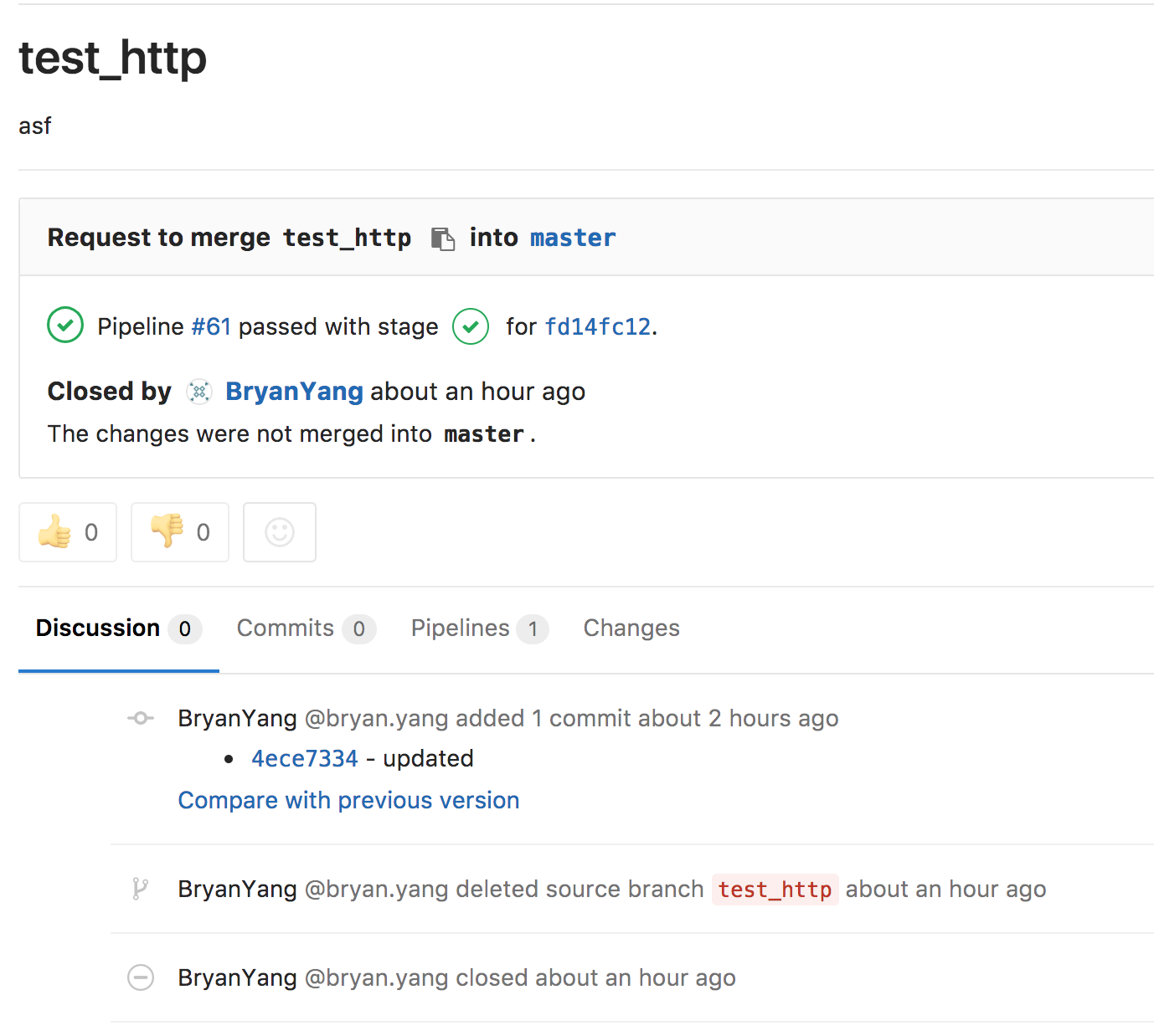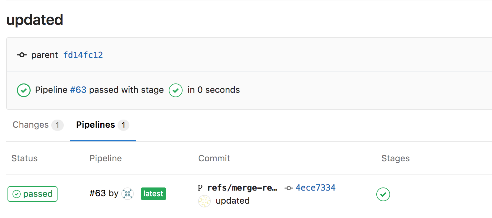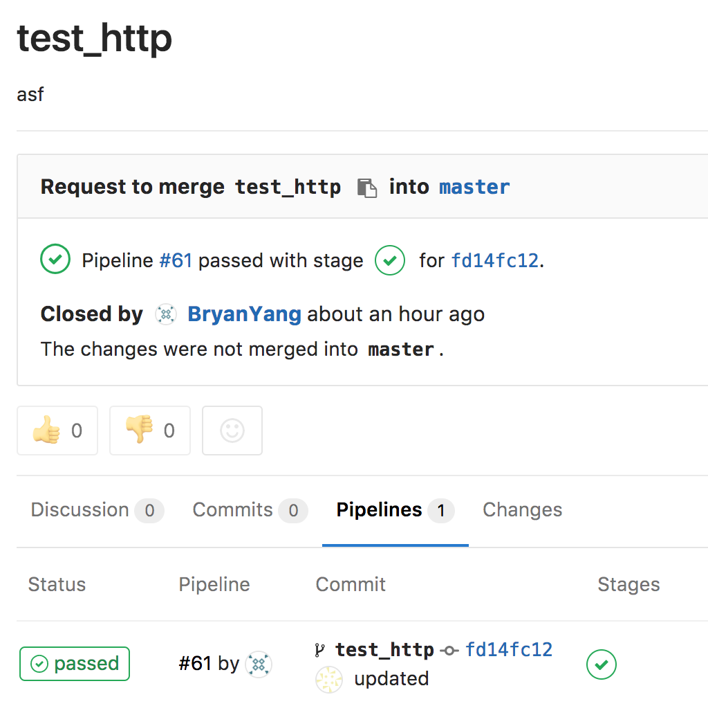 refs/heads/%storefs/merge-requests/%d/head. But when I add a new commit in a merge request, the pipeline won't include in the MR because of the name of branch ofcommitdidn't match the name of original branch.This is a normal pipeline when I pushed a new branch to Gitlab.