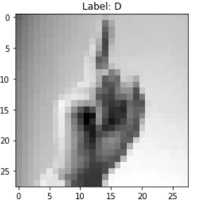As mentioned above, we will be using the MNIST ASL dataset for our project. The dataset is split into 80% training data and 20% testing data. The data is provided in the form of a CSV file with approximately 34,000 rows corresponding to every image/data point, as well as 785 columns, where the first column is the label of the image and takes values from 0-24 corresponding to the letters in the alphabet A-X (as mentioned, the letters Z and J involve movement in ASL and are therefore omitted from our project, this means there will be no labels 9 or 25) . The rest of the 784 columns are the values of every pixel from 1 to 784 in a 28x28 image, and since all images will be black and white, the values of these cells range from 0 to 255. After reading and processing the data into a panda’s data frame, we found out that there was no missing data and there were no values that were out of the ordinary (no pixel value was out of the range 0-255, and no label value was out of the range 0-24 excluding 9). As an example, this is the output for a randomly chosen image from the training dataset.
