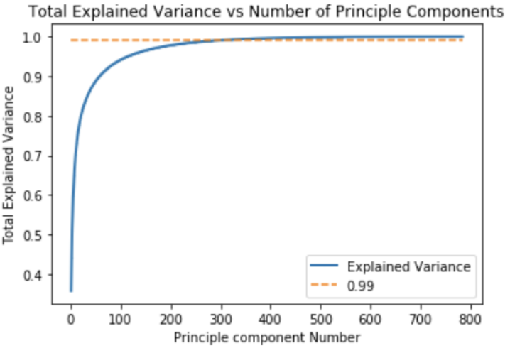 From the PCA model, we discovered that the first 150 principal components capture more than 96% of the total variance in the model. This can also be supported by the figure above where we see that the cumulative explained variance by the first 150 principal exponents exceeds the line 0.96. In some of the following algorithms we will be testing these 150 principle components and see if they can replace the original features.
