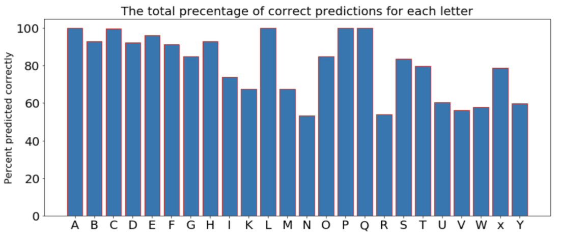 As we can see from the plot, the performance of the model varies significantly from letter to letter. the model performs best with the letter A at almost 100% accuracy, but performs the worst for the letter "N" with around 52% accuracy.