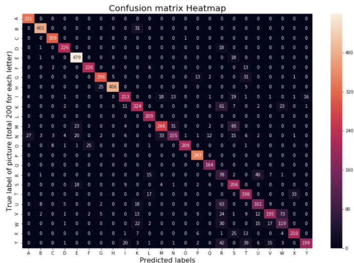 We can see the precision of the model is about 85%. There are some letters that perform poorly while some have accuracies as high as 100%. B, D, E are exceptionally well recognized by our model while X, R, U perform badly. The bad performance in recognizing R and U can be attributed to the similar looking signs as shown in the Logistic regression section. Overall, SVM performs very well in identifying signs.