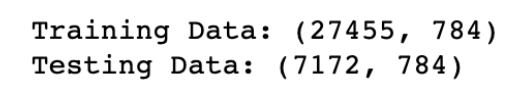 Using the sklearn package in Python, we easily formulated a multiclass linear regression model that uses the images of American Sign Language letters to classify which letter is being symbolized by the hand. We started by importing all the necessary modules and splitting the data into training and testing sets. An 80/20 percent split was used and resulted with the following number of instances with 784 pixels (28 x 28).