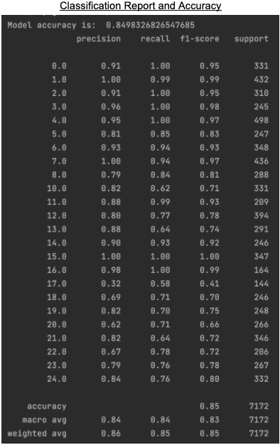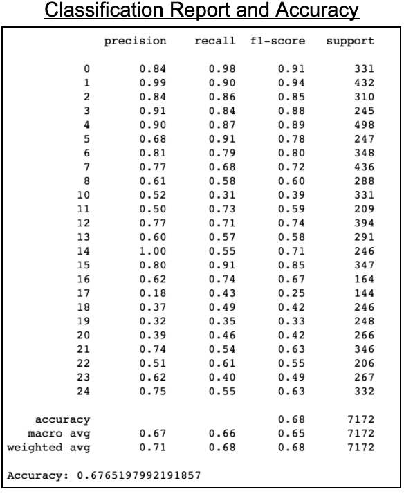 Using the above classification report and confusion matrix we can see which hand symbols were most accurately predicted correctly versus the ones that had the most issues. Letters A, B, E, F, and P performed particularly well while letters I, K, O, R, S, T, U, V, X performed particularly poorly.