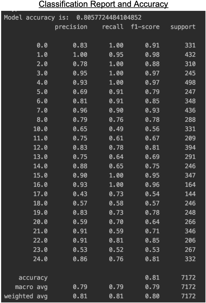 Next, we applied cross validation hyperparameter tuning to see if we could further increase the accuracy of our model.The main parameter that we optimized was C, the tradeoff between Maximizing the margin and correct classification. Switching from a c=1 to a c=0.5 we can see a 5% increase in the accuracy of our model. Further, using cross validation ensures that we do not overfit our model while testing for hyper parameters. Below is a classification report along with our model accuracy.