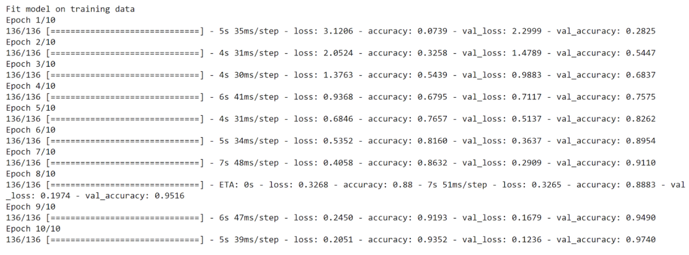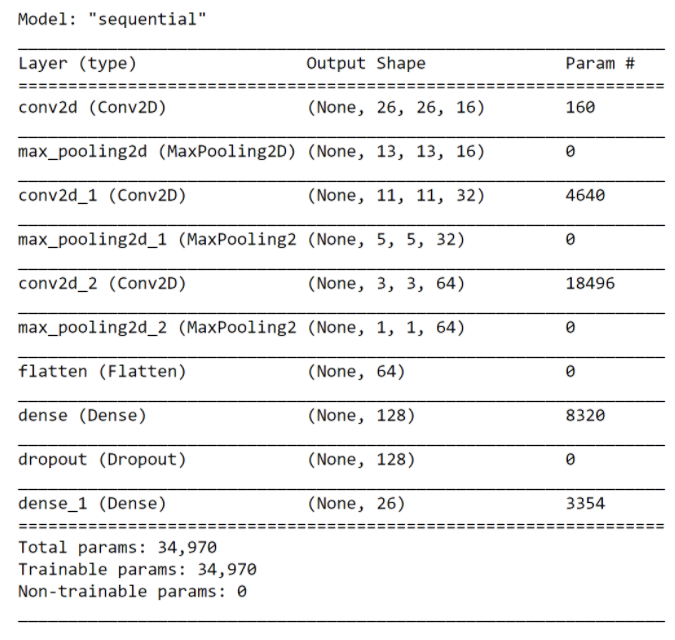 The model is then compiled with “adam” as the optimizer, accuracy as the main metric, and the main loss function being categorical cross entropy loss. After that it is trained based on the hyperparameters of batch size, number of classes, and number of propagations. The number of classes is determined by the amount of letters we wish to identify. The model runs through forward passes and back propagation as it is trained (and updates the parameters using gradient descent).