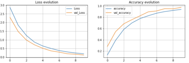 As we can see from the plots above, the model showed quick growth as the number of epochs increased and was able to achieve a near perfect accuracy towards the end. It finished with a 97% accuracy.